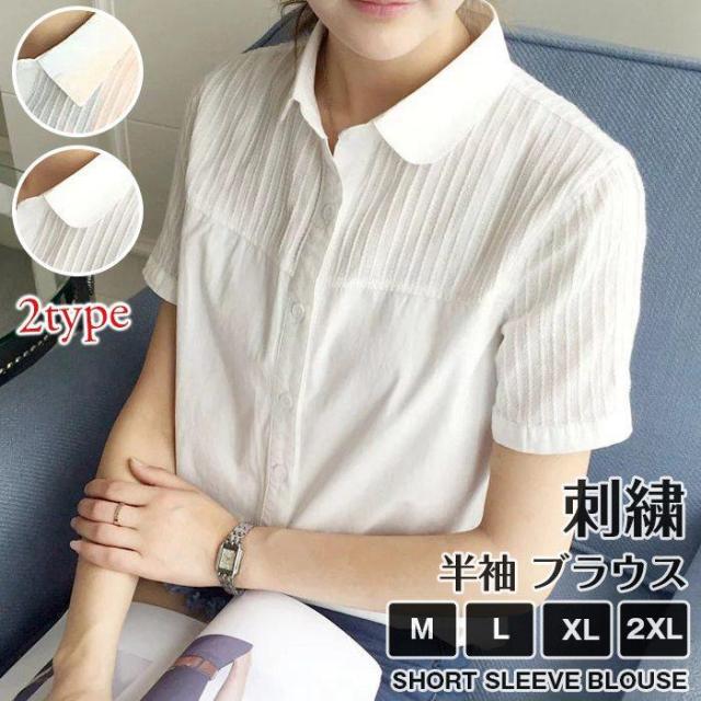 シャツ レディース 半袖 ブラウス 夏 コットン 刺繍 白 トップス オフィス カジュアル 綿 襟付き スーツインナー 大きいサイズ