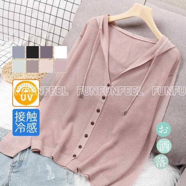 カーディガン フード付きカーディガン ニット 接触冷感 薄手 ボタン 羽織り UVカット 紫外線対策 エアコン対策 トップス