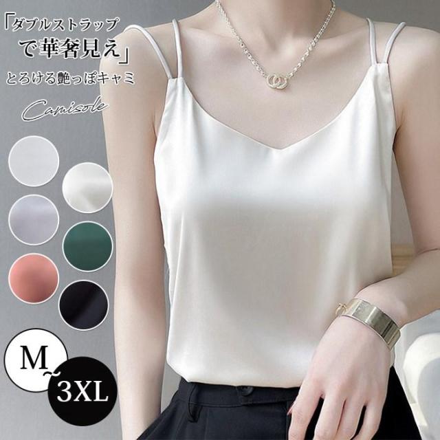 キャミソール サテン 大きいサイズ レディース きれいめ サテン風 光沢 Vネック バッククロス 薄手 トップス ノースリーブ インナー 下着 レイヤード 重ね着 コーデ フォーマル エレガント 上品 オフィス 部屋着 薄手 白 黒 夏 春