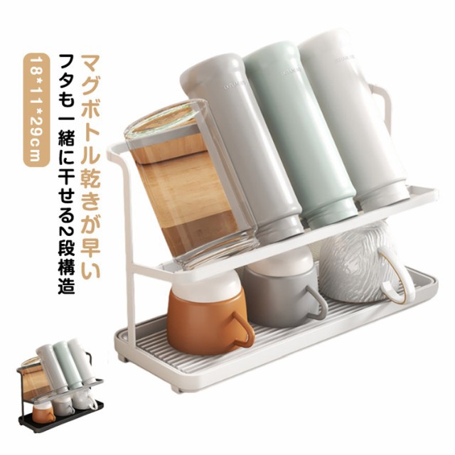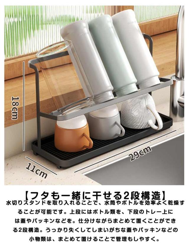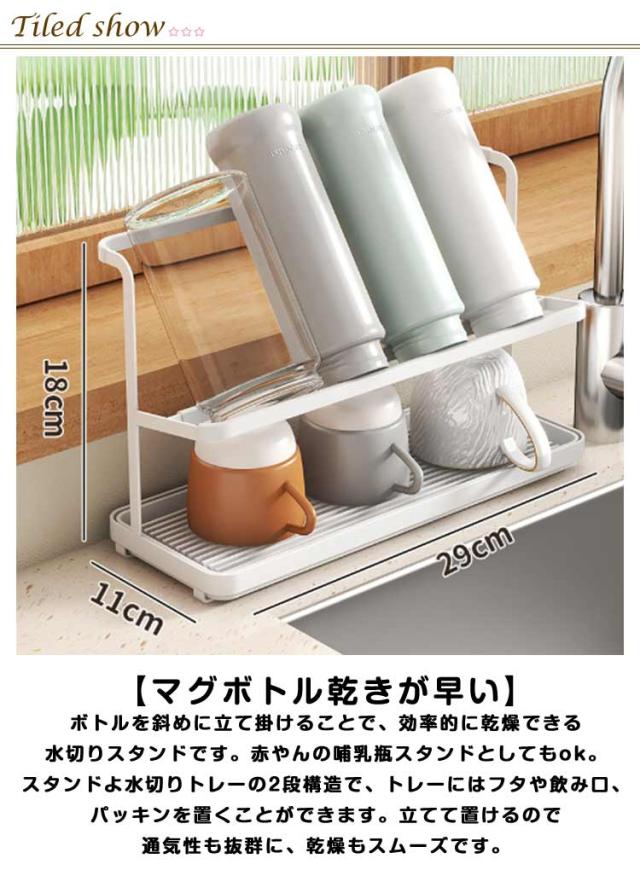 | 【マグボトル乾きが早い】ボトルを斜めに立て掛けることで、効率的に乾燥できる水切りスタンドです。赤やんの哺乳瓶スタンドとしてもok。スタンドよ水切りトレーの2段構造で、トレーにはフタや飲み口、パッキンを置くことができます。立てて置けるので通気性も抜群に、乾燥もスムーズです。 【フタも一緒に干せる2段構造】水切りスタンドを取り入れることで、水筒やボトルを効率よく乾燥することが可能です。上段にはボトル類を、下段のトレー上には蓋やパッキンなどを。仕分けながらまとめて置くことができる2段構造。うっかり失くしてしまいがちな蓋やパッキンなどの小物類は、まとめて置けることで管理もしやすく。 【洗いやすくて清潔に保てる】本体、トレーごとに分解できるので、すみずみまで洗えます。洗ったものを収納するからこそ、清潔に保てるのも嬉しいポイントです。キッチンに新しい外観を与え、毎日使用する水筒やカップを清潔で乾燥した状態に保つ、定期的なお手入れでカビや水垢を防ぐことができます。 | |