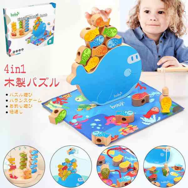 4IN1 木製パズル 木製おもちゃ 紐通しおもちゃ お釣り 魚遊び バランスゲーム パズル かわいい 魚おもちゃ 釣りゲーム 男の子