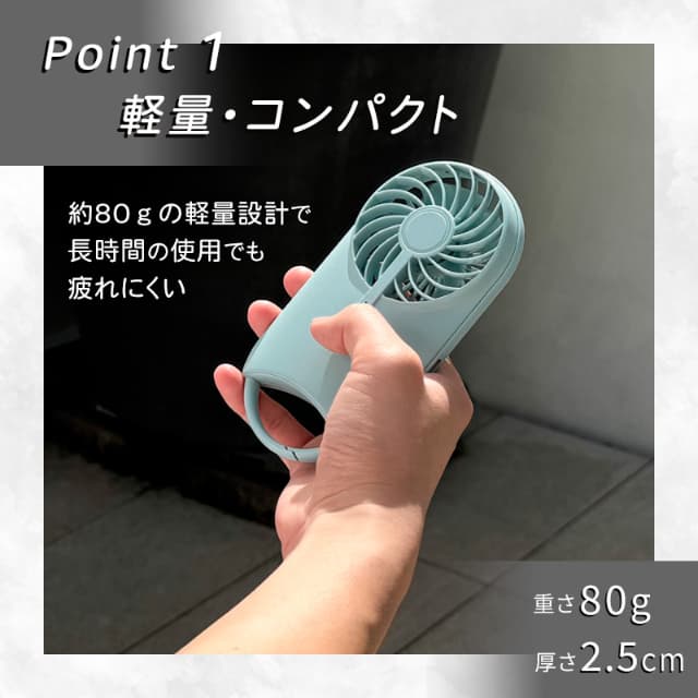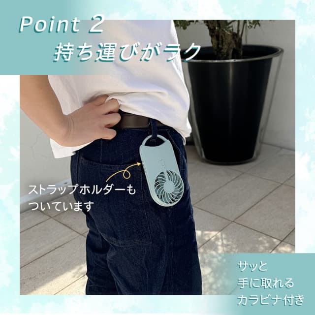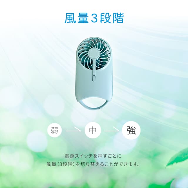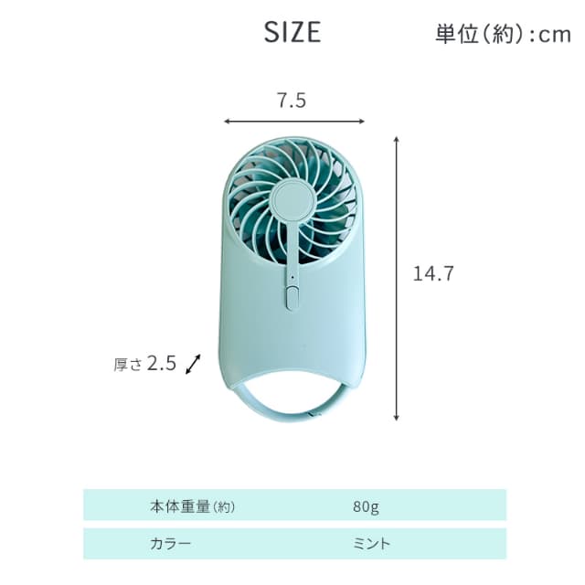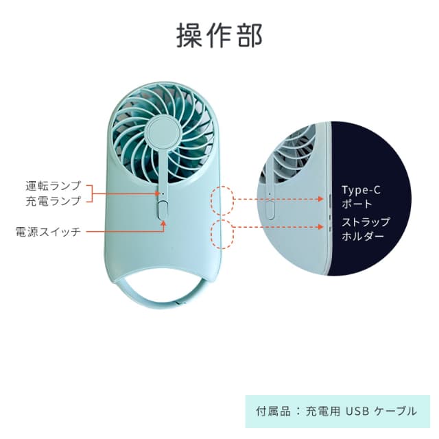 | 主な機能 | 充電式(USB Type-C)、風量3段階、背面スタンド、カラビナ |