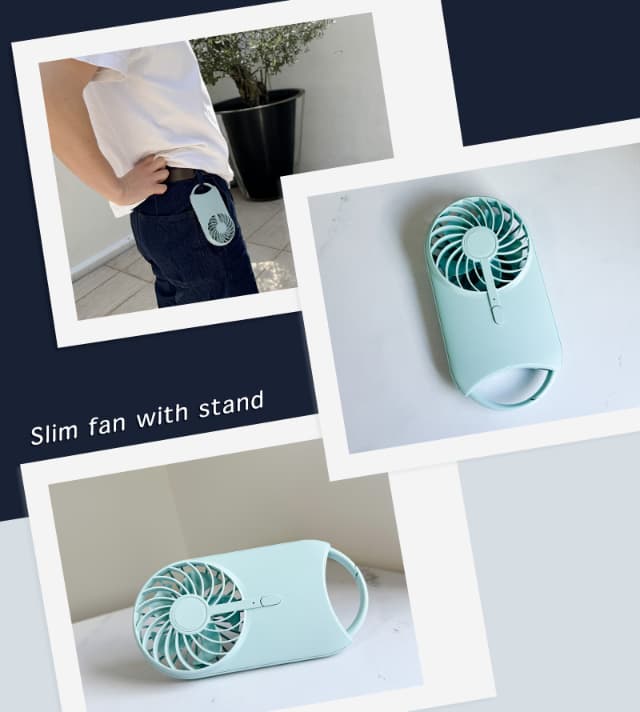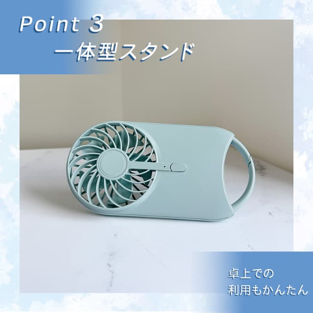 - 卓上ファンとして利用時には本体一体型のスタンドが便利。