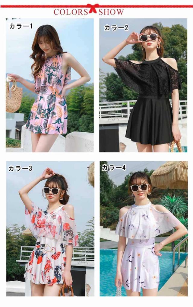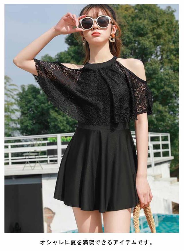 ワンピース 水着 体型カバー レディース ママ水着 オフショルダー オールインワン 体型カバー水着 ワンピース水着 黒 露出控えめ ぽっちゃり 女性 大人女子 フレアスカート 可愛い お洒落 二の腕 お腹 胸元 お尻 太もも カバーアップ みずぎ ミズギ