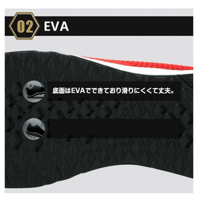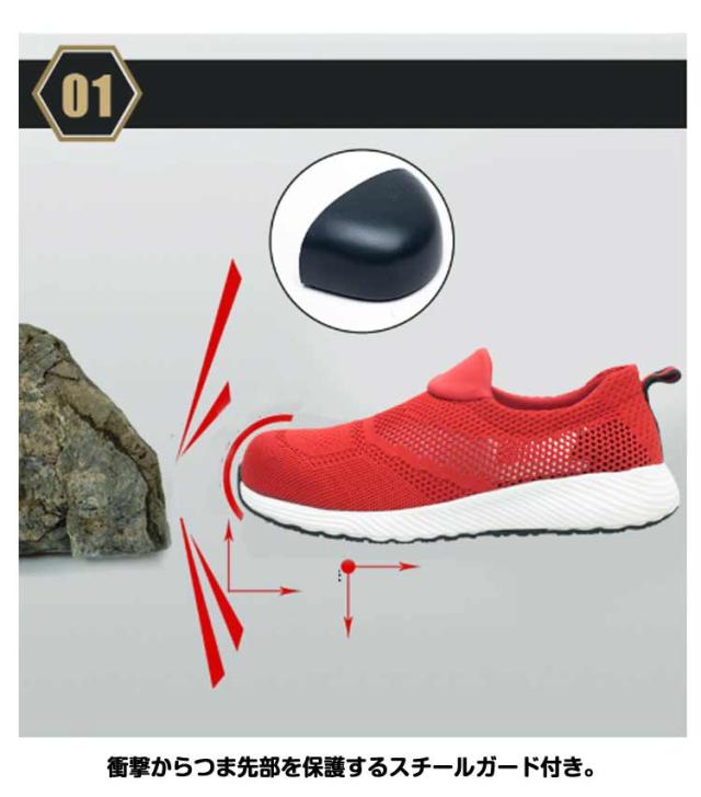 | 通気性抜群のメッシュ素材のスチール先芯入り安全靴。 衝撃からつま先部を保護するスチールガード付き。 底面はEVAでできており滑りにくくて丈夫。 アッパーは靴内のムレを軽減するメッシュニット素材を採用。 フィット感にこだわった、脱ぎ履きが簡単なスリッポンタイプ。 | |