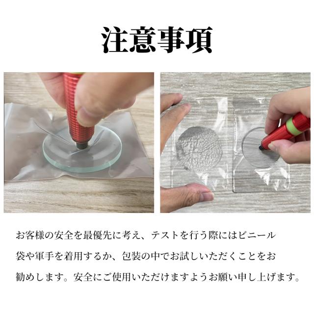 ・テストの際、割れた破片が飛び散る可能性がありますので、必ず防護対策(付属の袋に入れるなど)を取った上でテストを行ってください。