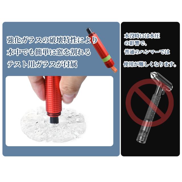 ・車用脱出用ハンマーは、ガラス破砕性能保証のためテスト用ガラスを付属しております。ご自身でガラスが割れるかどうかテストをしていただけます。