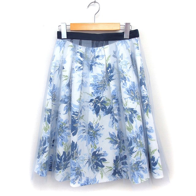 【中古】ジャスグリッティー JUSGLITTY チュール レイヤード タック フレアスカート 花柄 ひざ丈 2 ブルー 青 /FT11