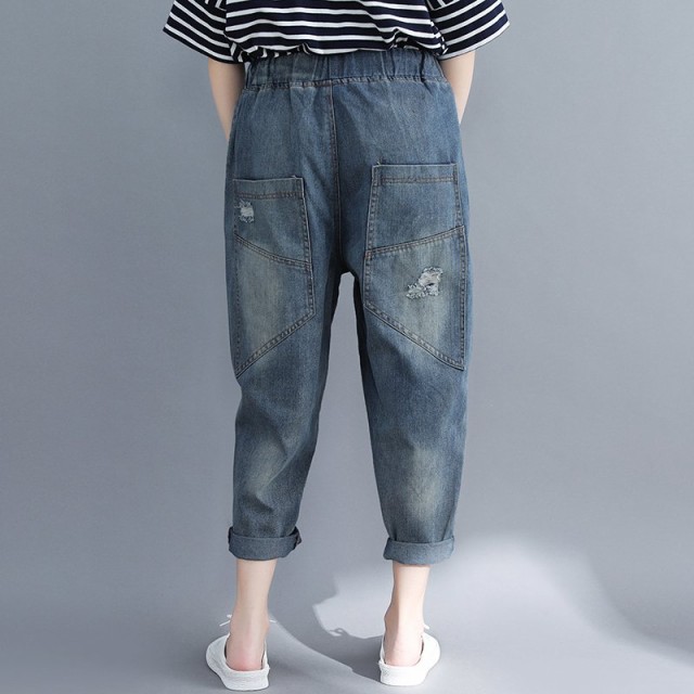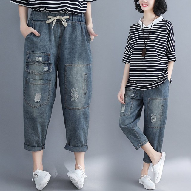春夏新作 レディース デニムパンツ ガウチョ ワイドパンツ 九分丈ジーンズ ボトムス レディース サルエルパンツ ダメージ加工 ウエストゴム 大きいサイズ