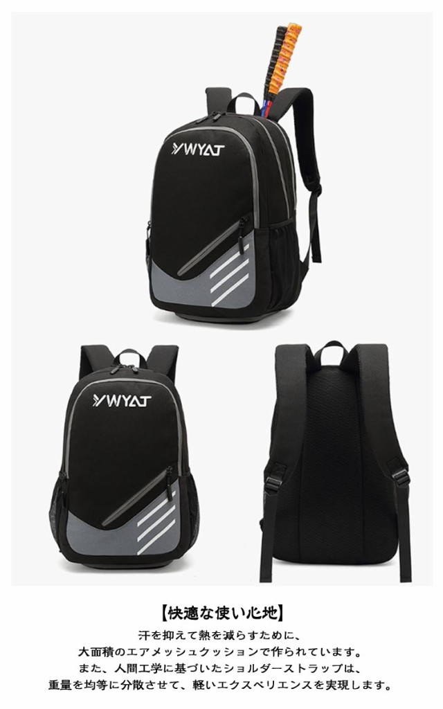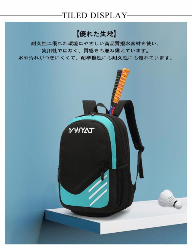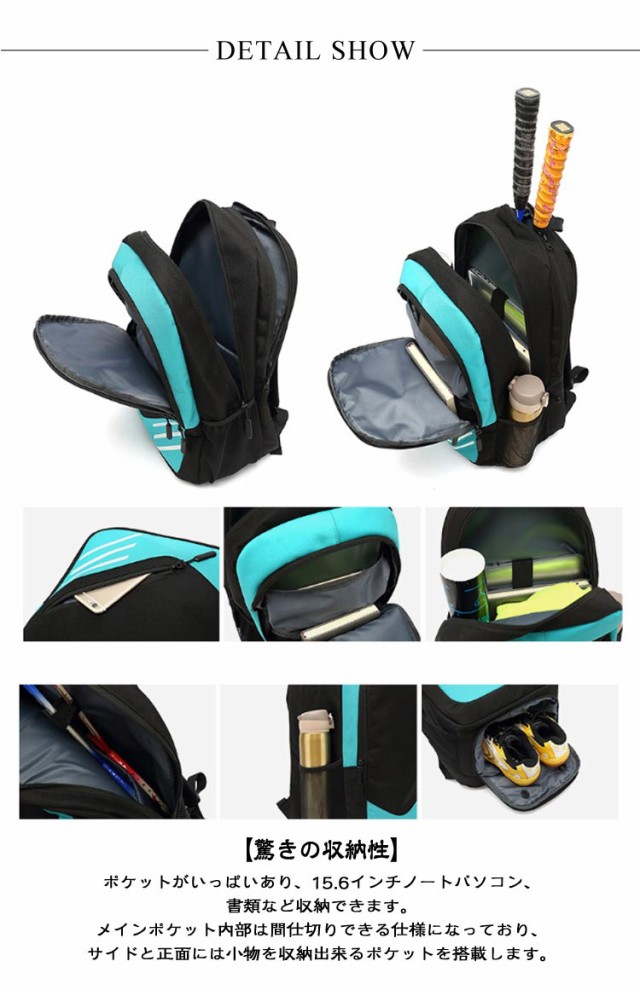 | ラケットバッグ 2本用 撥水機能 たっぷり収納! シューズケース付き ★【優れた生地】 耐久性に優れた環境にやさしい高品質撥水素材を使い、実用性ではなく、質感をも兼ね備えています。水や汚れがつきにくくて、耐摩擦性にも耐久性にも優れています。 ★【驚きの収納性】 ポケットがいっぱいあり、15.6インチノートパソコン、書類など収納できます。メインポケット内部は間仕切りできる仕様になっており、サイドと正面には小物を収納出来るポケットを搭載します。 ★【シューズポケット&ラケットポケット】 底に隠れた靴収納ポケットが付いています。背面のラケットポケットにはラケットを2本収納することが可能です。 ★【快適な使い心地】 汗を抑えて熱を減らすために、大面積のエアメッシュクッションで作られています。また、人間工学に基づいたショルダーストラップは、重量を均等に分散させて、軽いエクスペリエンスを実現します。S形科学的な荷重の肩ヒモを採用し、肩と背中の負担を効果的に分散させ、背負う時の圧力を軽減します。 | |