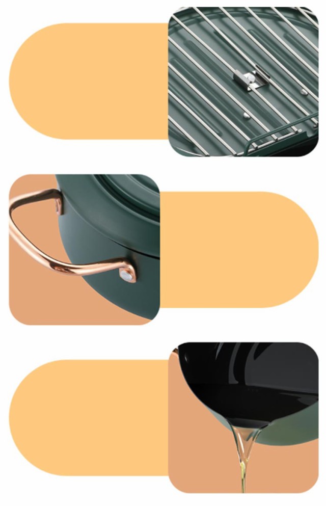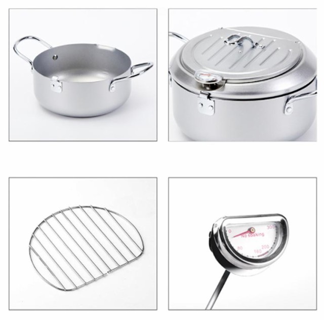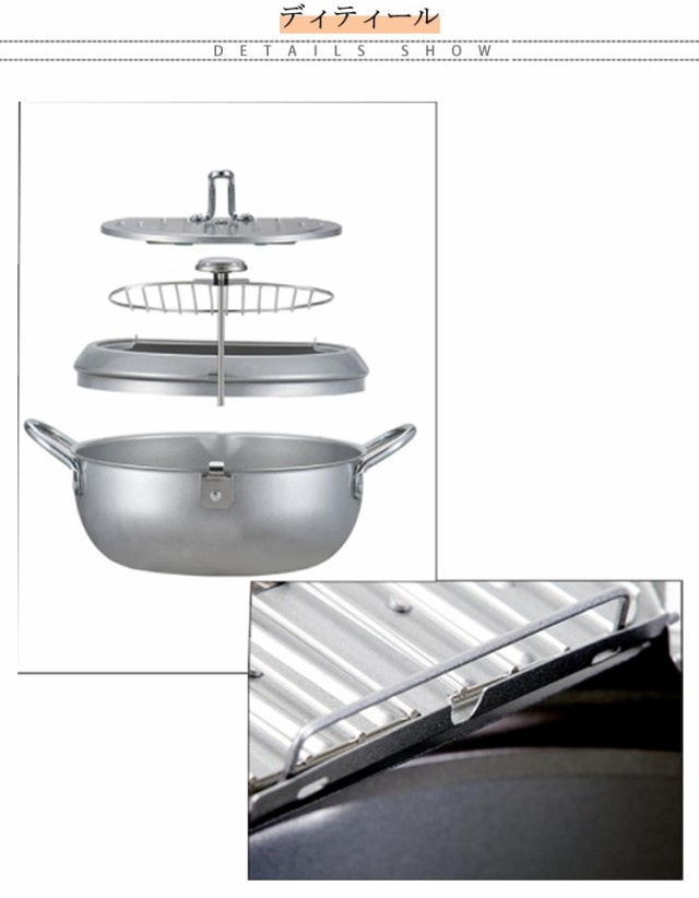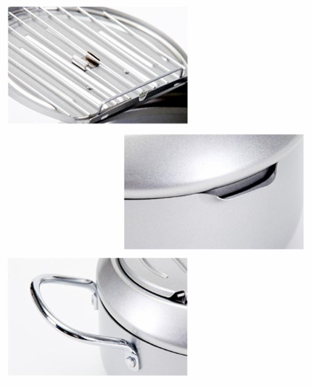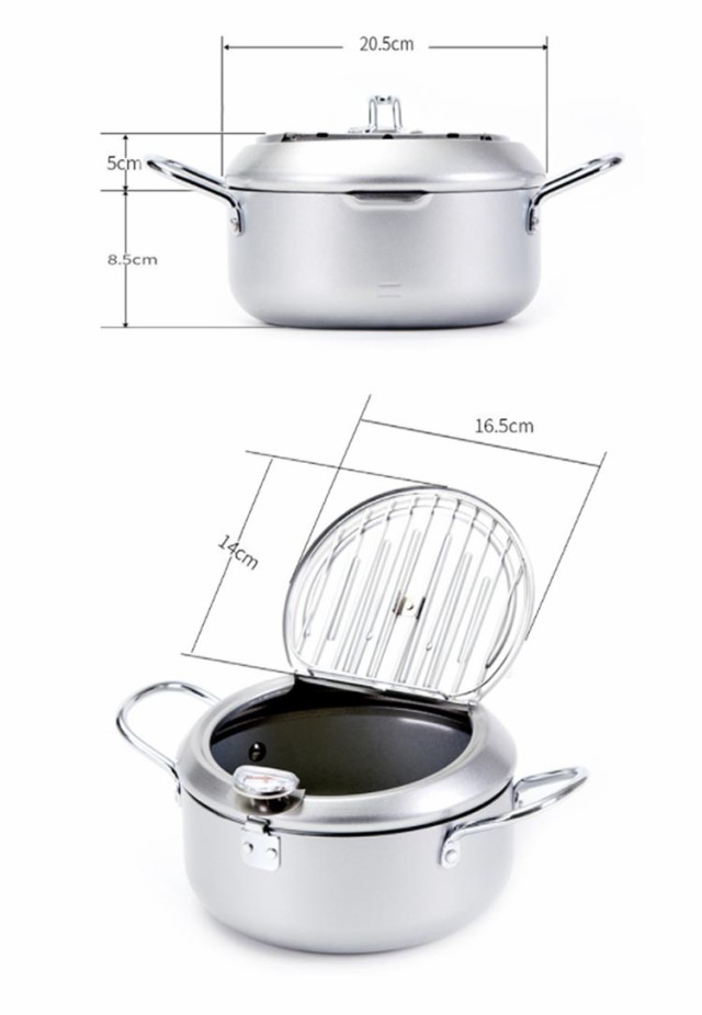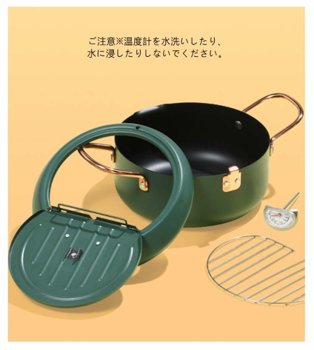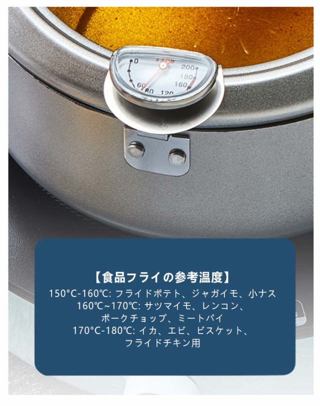 | 鉄製 IH・ガス火対応 揚げ網&温度計&蓋付き 油はね防止 天ぷら鍋 直径20cm/24cm/28cm ●蓋の裏で油切りができる! 蓋の裏に油切用のワイヤー付き。場所を取らずに油切りができます。 また、ワイヤー部分は取り外しできるので、洗うのも簡単です。 ●オール熱源対応 ガス火、IH、電気コンロなどオール熱源対応! 熱源を選ばずどのご家庭でもご使用いただけます。 ●油はねが気にならない! 油はね防止ガードが付いているので、安心して調理できます。 ●温度計付き 油の温度が一目で確認できるので、食材に合わせて美味しく調理ができます。 【食品フライの参考温度】 150°C-160℃: フライドポテト、ジャガイモ、小ナス 160℃~170℃: サツマイモ、レンコン、ポークチョップ、ミートパイ 170°C-180℃: イカ、エビ、ビスケット、フライドチキン用 ご注意※温度計を水洗いしたり、水に浸したりしないでください。 | |