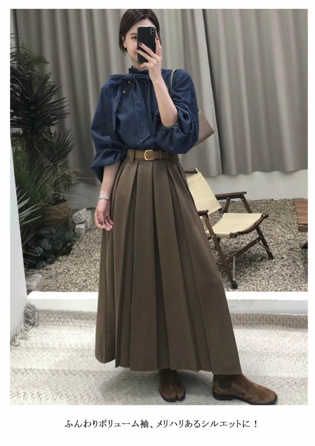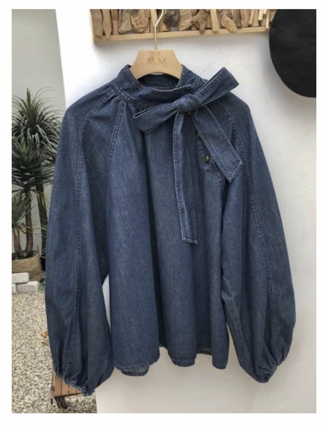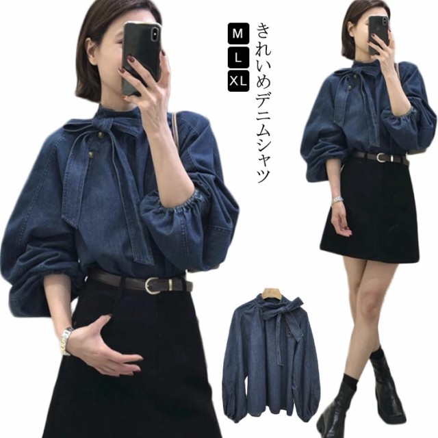 デニムシャツ 長袖 トップス 大人女性 デニムシャツ ぽわん袖 デニムブラウス カジュアル ボリューム袖 シャツブラウス レディース 体型カバー リボン付き おしゃれ ブラウス トップス 春新作 かわいい デニムトップス 春秋 無地 リボン