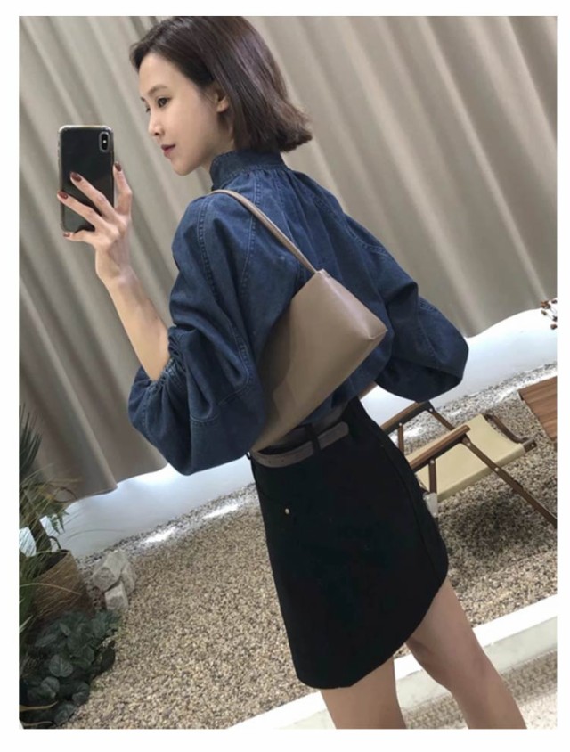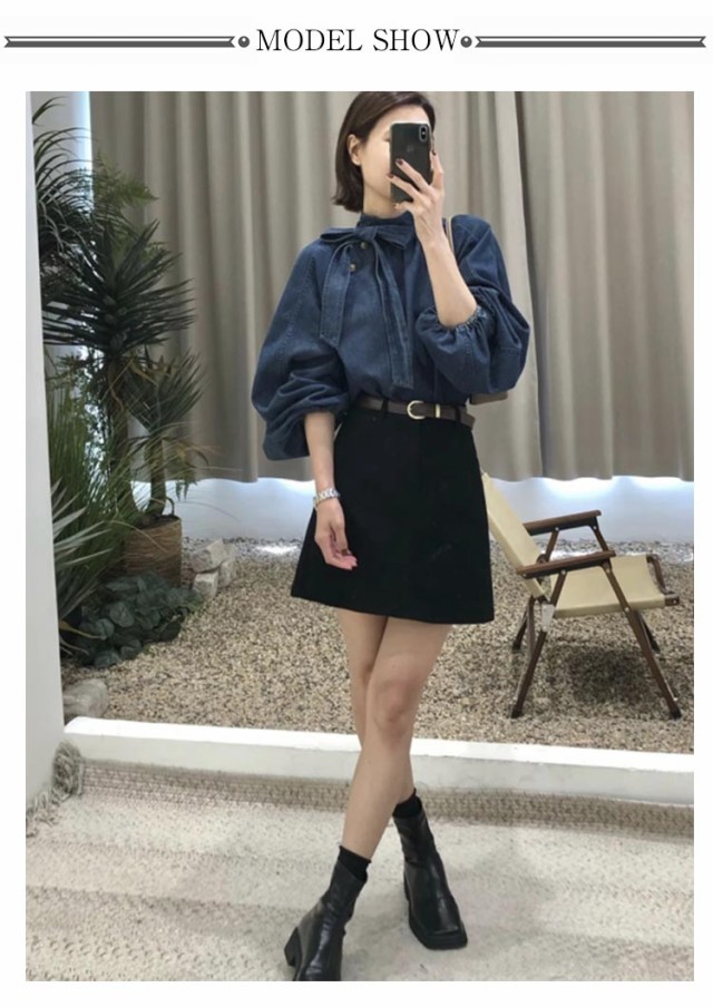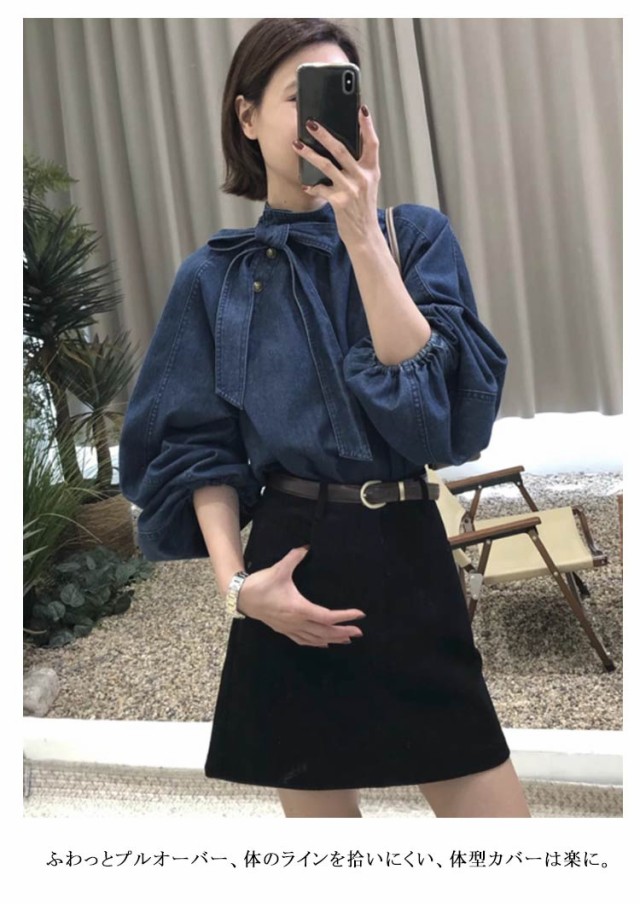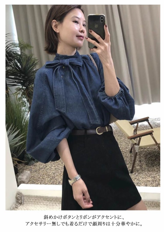 | きれいめデニムシャツ 斜めかけボタンとリボンがアクセントに、アクセサリー無しでも着るだけで顔周りは十分華やかに。 ふわっとプルオーバー、体のラインを拾いにくい、体型カバーは楽に。 ふんわりボリューム袖、メリハリあるシルエットに! | |