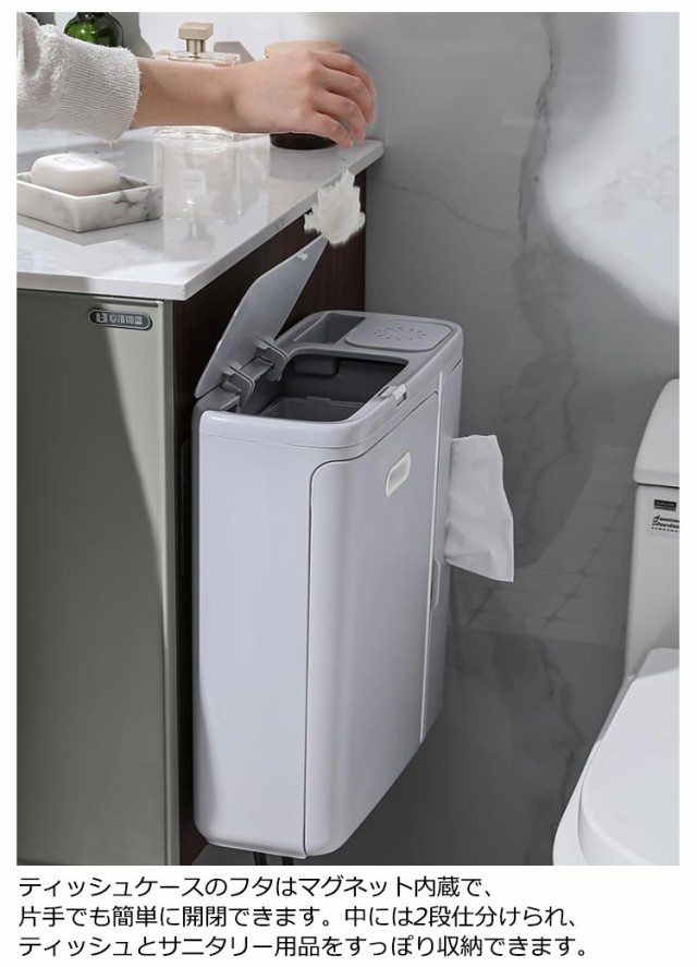 | ティッシュボックス付きゴミ箱♪ ティッシュを使用後、ポイッと捨てられるごみ箱、キッチンや洗面所、トイレなどオールマイティに活躍します。 そのまま置いてもOK!付属の貼って剥がせる透明なフィルムフック使って壁に浮かせても◎ スリムで設置場所を選ばないマルチに活躍するフタ付きゴミ箱。 ティッシュケースのフタはマグネット内蔵で、片手でも簡単に開閉できます。中には2段仕分けられ、ティッシュとサニタリー用品をすっぽり収納できます。 ダストボックスは取り外しできるから、ゴミ袋を簡単に設置でき、ゴミの出し入れも簡単。ゴミを隠し清潔感をキープできる優れもの。 スマホ置きや消臭剤入れも完備する多機能ゴミ箱です。 | |