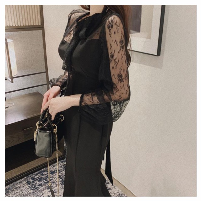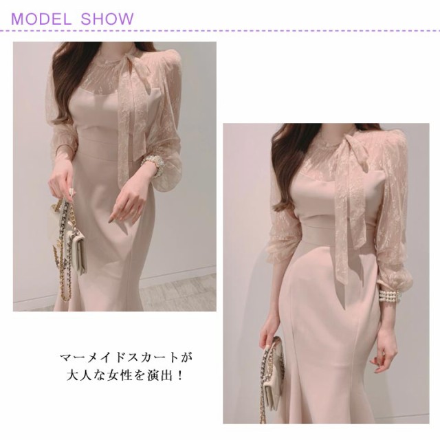 パーティードレス お呼ばれドレス 結婚式ドレス タイトドレス マーメイドワンピース マーメイド マーメード 韓国 結婚式 ワンピース ロング丈 異素材 レース おしゃれ 同窓会 成人式 20代 30代 40代 黒 ピンク ボウタイ 春 夏 秋 冬 長袖 可愛い お呼ばれ 二次会 披露宴