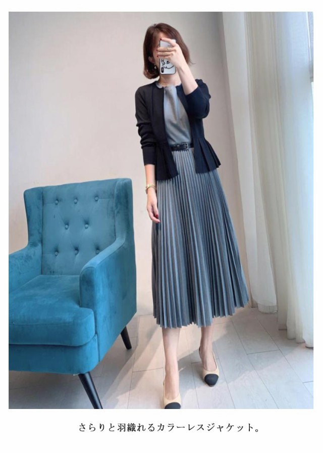 | アウター+ワンピースがセットになるフォーマルスーツ さらりと羽織れるカラーレスジャケット。 ジャケットの裾部分には、贅沢な印象のタックプリーツをあしらいました。 ワンピースはスタイルアップして見えるAラインのシルエット。 細かいプリーツと高め位置の切り替えによる縦長効果でスタイルアップも叶う。 落ち着いた大人の女性らしい、通勤スタイルにも取り入れやすいデザインです。 | |