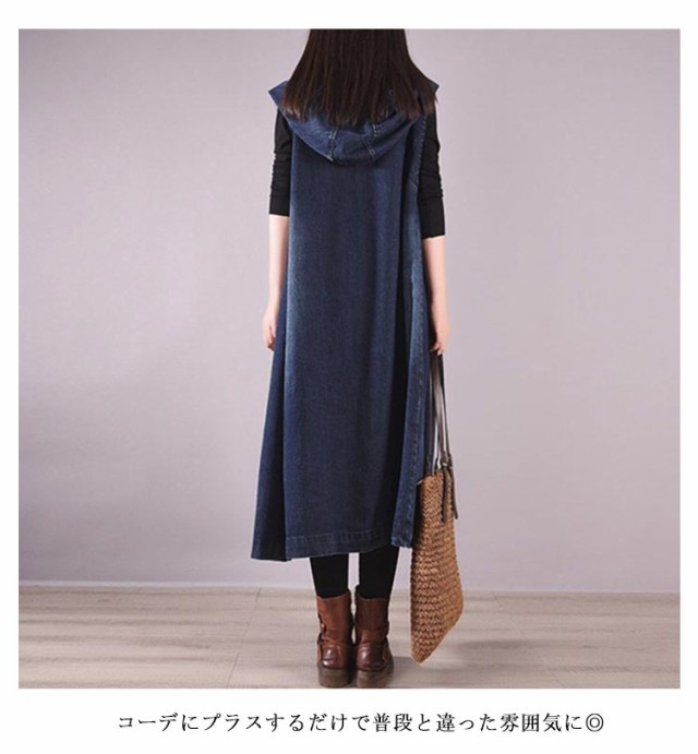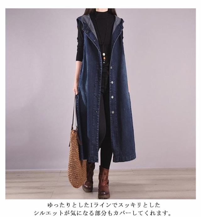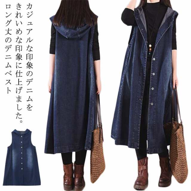 デニムベスト ベスト 前開き ロングベスト レディース ロング丈 ノースリーブ 体型カバー デニムアウター ライトアウター ゆったり ロングジレ ロングベスト ジャケット ジレ 羽織り カジュアル フード付き 着痩せ 可愛い 大きいサイズ 通勤 30代 40代 50代 送料無料