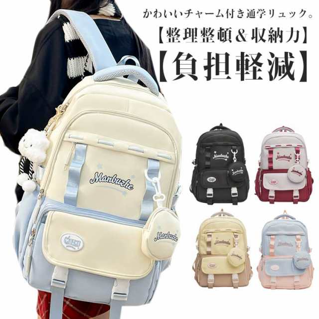 | かわいいチャーム付き通学リュック。 【整理整頓&収納力】ポケットがたくさん付いています。必要なものを取り出しやすく持ち物の紛失防止に。外出時に持っておきたい荷物を全てバッグに入れてお出かけできます。 【負担軽減】厚みがあるメッシュ素材を採用したパットは肩・腰への負担が減らします。 【多用途】通学や遠足、中学・高校などの通学用、ピクニックやショッピングなどのお出かけ、修学旅行のお泊りバッグまで幅広いシチュエーションで大活躍間違いなしのアイテムです。 | |