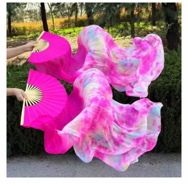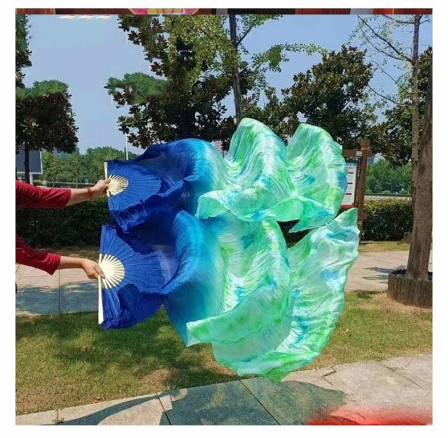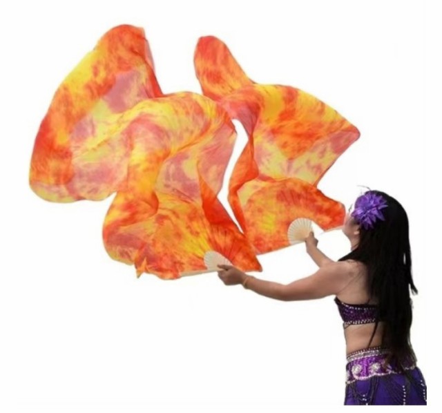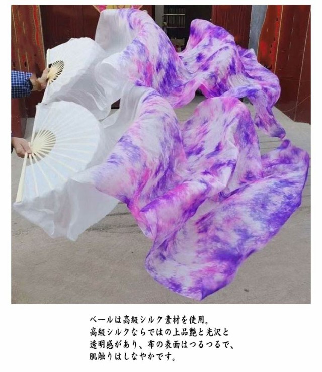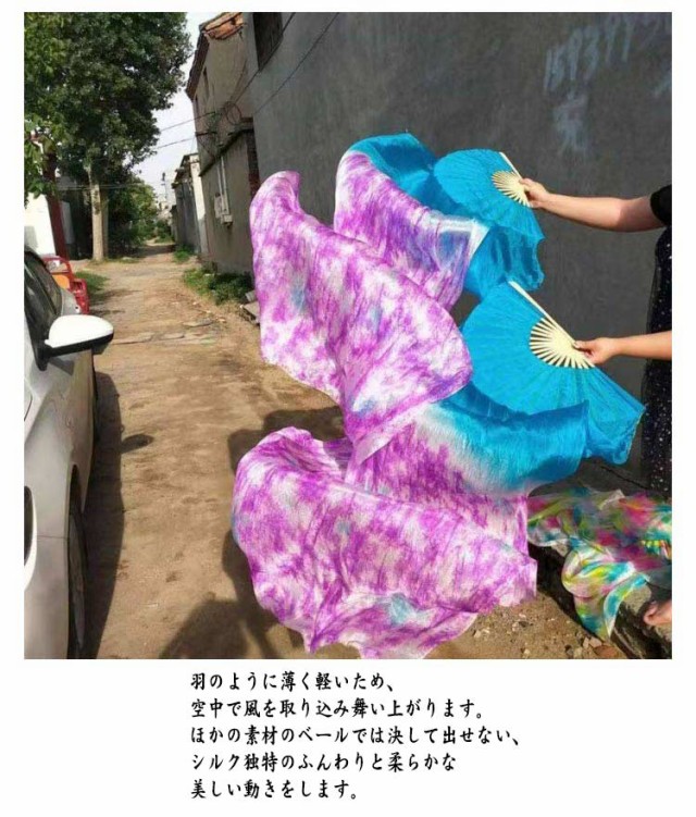 | 高級感のあるリアルシルクを使用したベリーダンスファンベール。【2本セット】 ベールは高級シルク素材を使用。高級シルクならではの上品艶と光沢と透明感があり、布の表面はつるつるで、肌触りはしなやかです。 羽のように薄く軽いため、空中で風を取り込み舞い上がります。ほかの素材のベールでは決して出せない、シルク独特のふんわりと柔らかな美しい動きをします。 片手でも難なく開く事が出来、発色のよい鮮明なカラーで華やかに一目を引きます。 | |