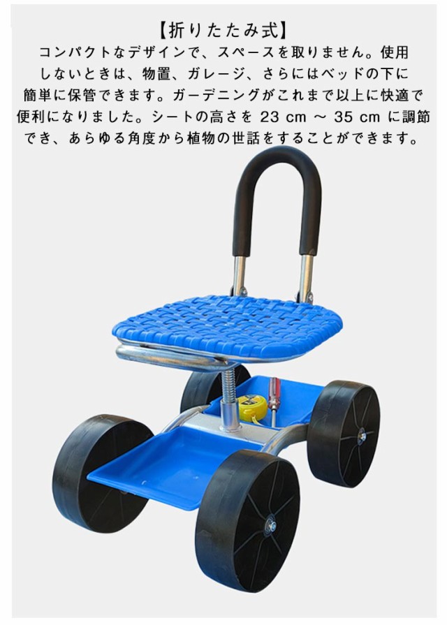 ガーデンカート 車輪付き ガーデニングカート 椅子 腰掛け台車 背もたれ付き 360°回転 座面 高さ調節 農作業 腰掛け 園芸用カート 4輪 座れる 折りたたみ 収納機能 畑仕事 作業カート 横移動 台車 作業椅子 タイヤ付き