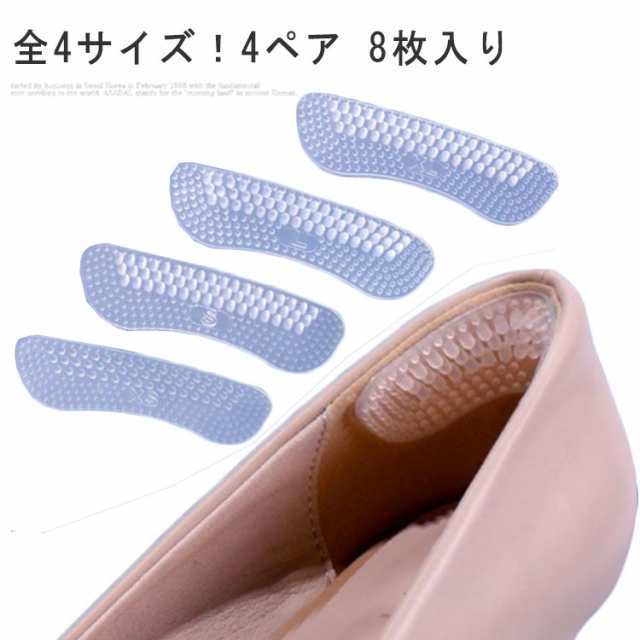 | 全4サイズ!4ペア 8枚入り ズレ防止・痛み防止・クリアなかかとパッド。 靴擦れでかかとが痛い、サイズが合わなくパカパカするなど悩みを解消するインソールかかとパッド。 靴のかかとに貼るだけで、ソフトなクッションがかかとをグリップして靴を脱げにくくし、 歩行を楽にする靴ずれ、うおのめ防止パッドです。 ソフトであたりの良いシリコン素材を使用し、摩擦によっておこるかかとへの負担を軽減します。特にかかとが抜けやすいパンプス、ビジネスシューズに。 強力粘着シール付きで程よい厚みのクッション入り!かかとのカーブにフィットする柔軟性。 凸凹のあるデザイン、滑り止め効果抜群で、ストッキングを履いても脱げにくく、快適な歩行をサポート。 | |
