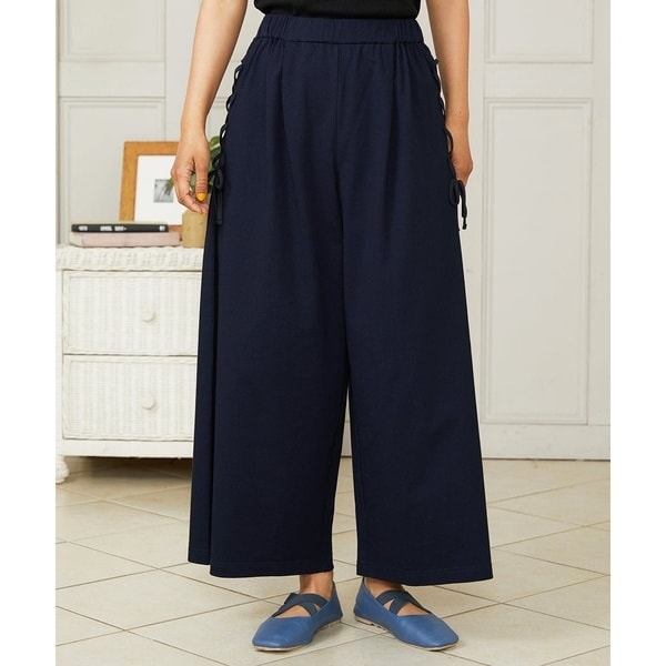 こだわりの詰まったワイドパンツ。足さばきの良いワイドなシルエットです。植物のツタのようなサイドのレースアップがデザインのポイント。紐の調節でシルエットの変化を楽しめます。後ろのポケット口にはお花の刺繍を施したレースのパーツを組み合わせた大人かわいいデザイン。ウエストをオールゴムでお仕立てしたリラクシーなイージーパンツです。