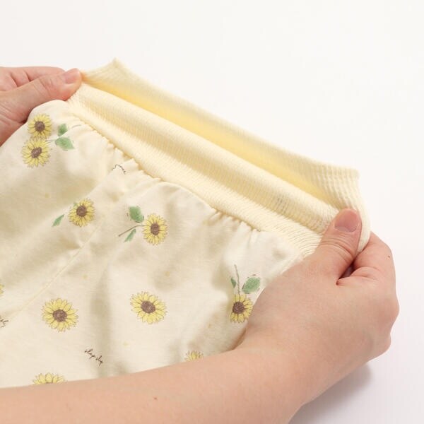 ■素材:ホワイト×はたらくくるま×恐竜/ピンク×アイスリボン×フリル/ブルー×恐竜と海と空の仲間たち/イエロー×ひまわり×フリル:【トップス】綿100% 【ボトムス】(本体)綿100%リブ:綿94% ナイロン4 %ポリウレタン2%