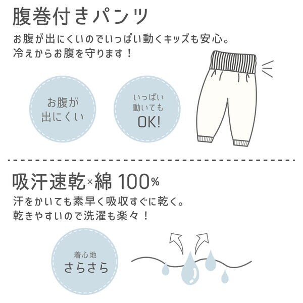 腹巻き部分で朝までおなかをガードしてくれるから、キッズはもちろん、子どもの寝冷えを気にせずママパパぐっすり。