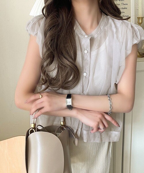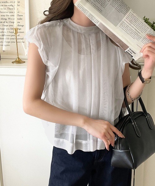 “天使の羽チュール” 軽やかなエアリー感が今っぽい。前後2wayタックデザインノースリーブブラウス