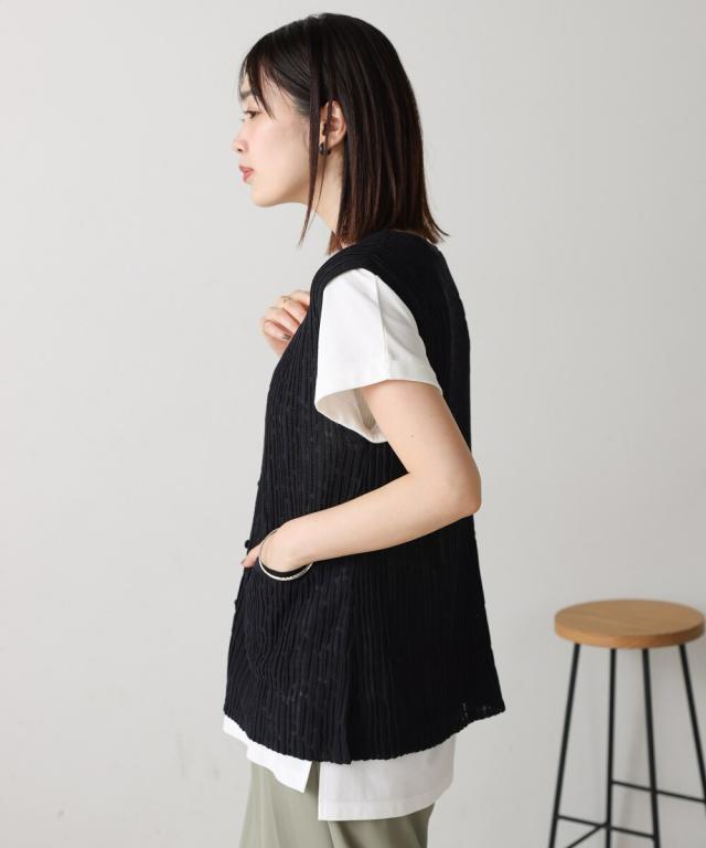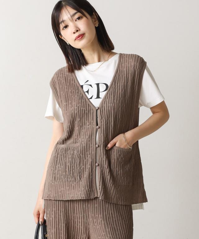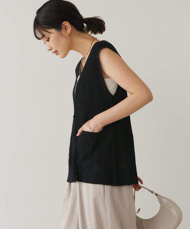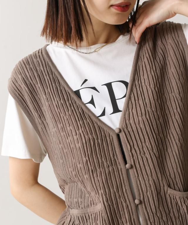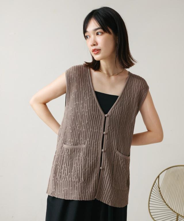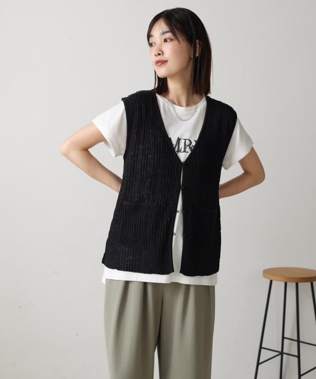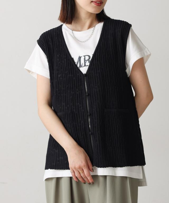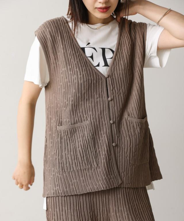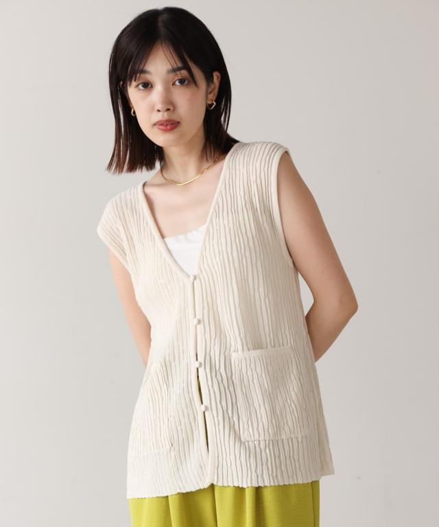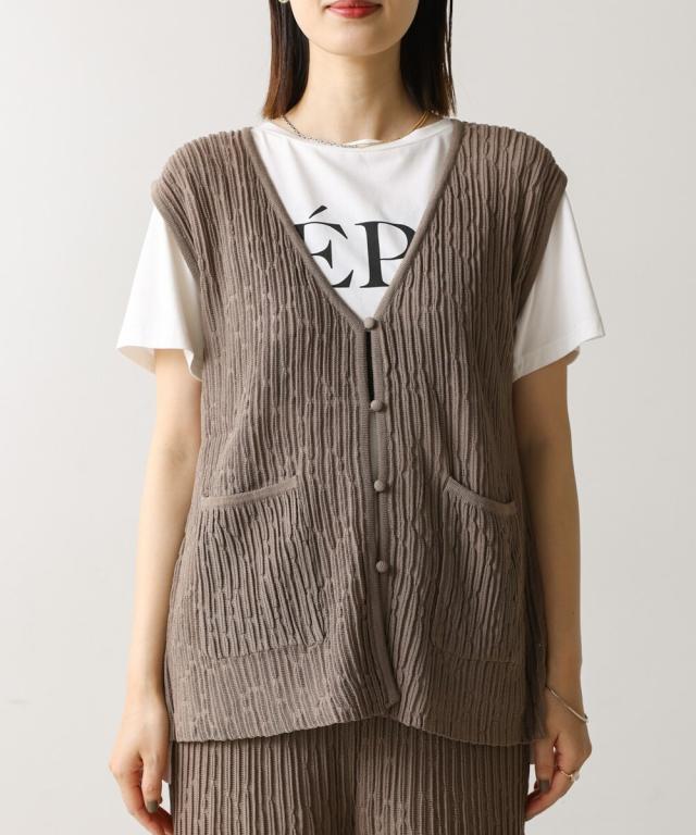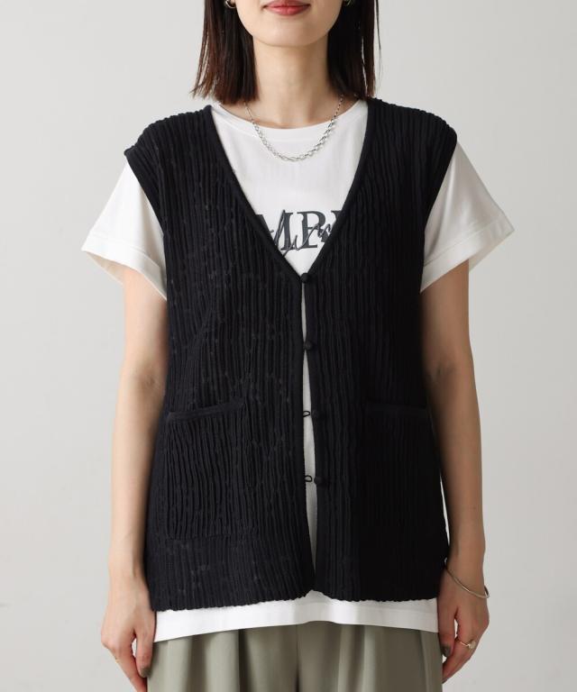 さらりとした素材感のサマーニットベスト。表面が凹凸感のある表情でシンプルな装いでもコナレタ印象に仕上げてくれます♪前を閉めてトップスのように着こなしても、カットソーに合わせてベストっぽく着ても◎