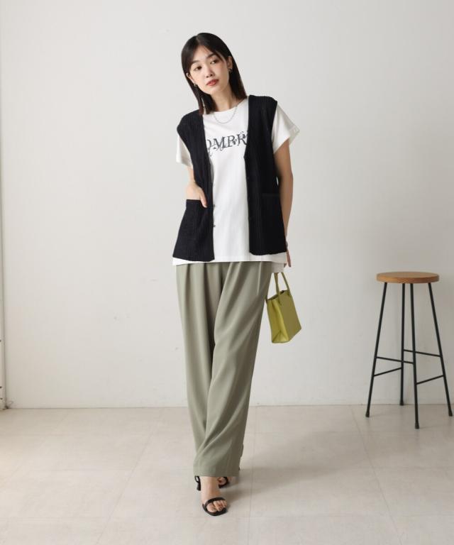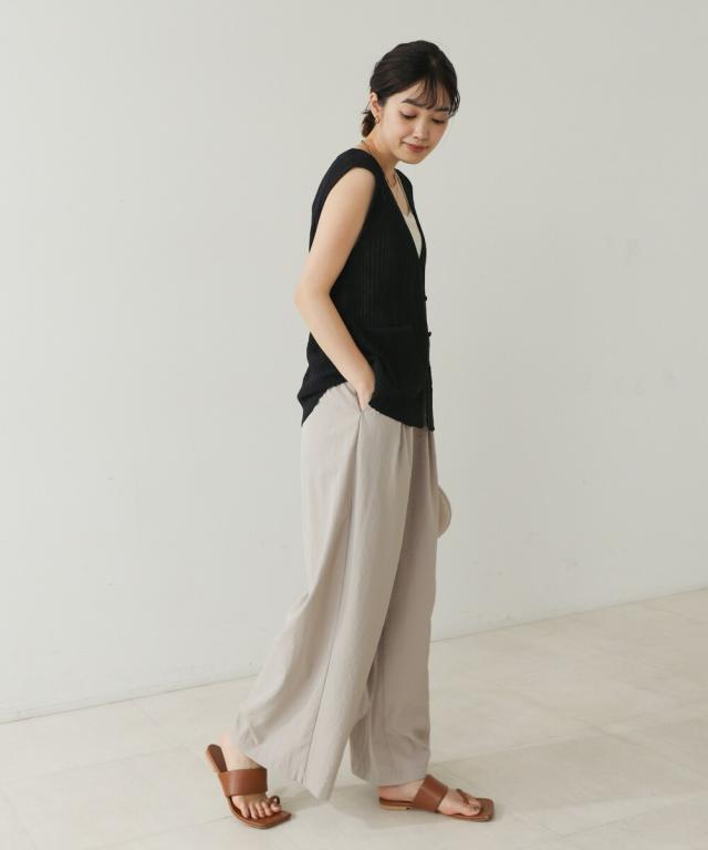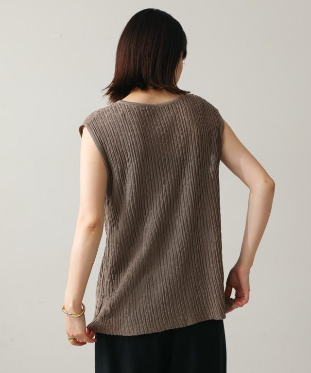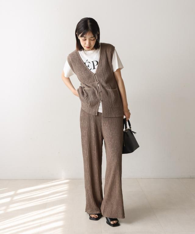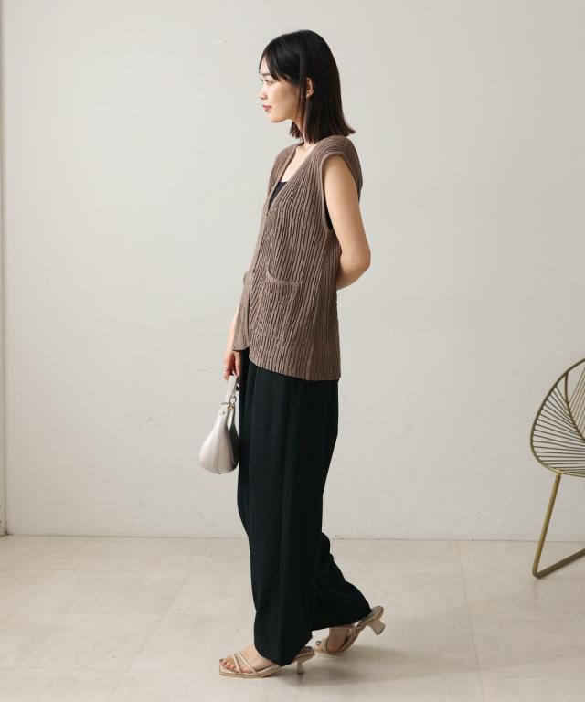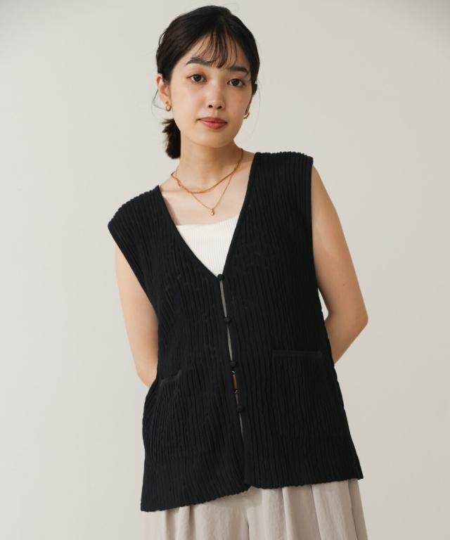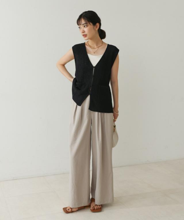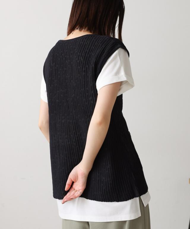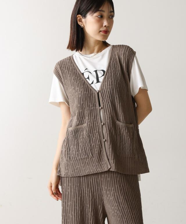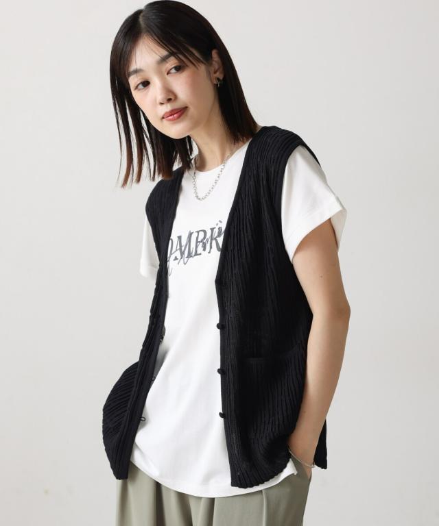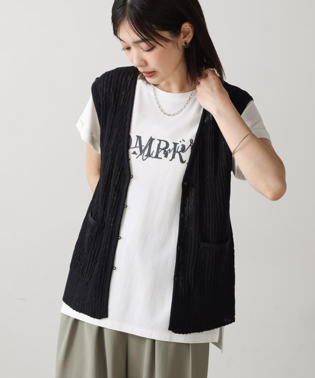 さらりとした素材感のサマーニットベスト。表面が凹凸感のある表情でシンプルな装いでもコナレタ印象に仕上げてくれます♪前を閉めてトップスのように着こなしても、カットソーに合わせてベストっぽく着ても◎