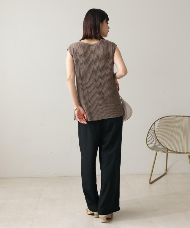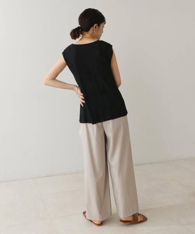 強撚された糸で編んでいるので、さらさらとした素材感のニット素材。凹凸がある編み方で、風が抜けるので涼しく着て頂けます。