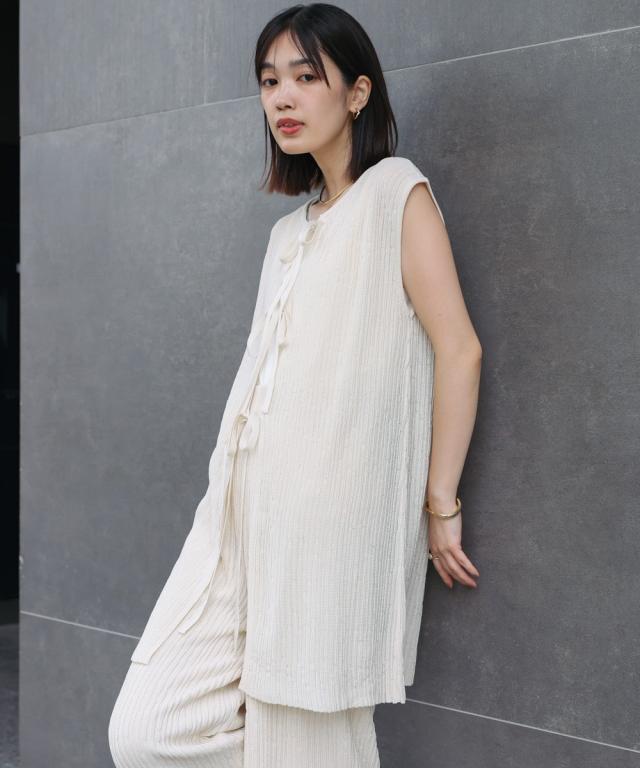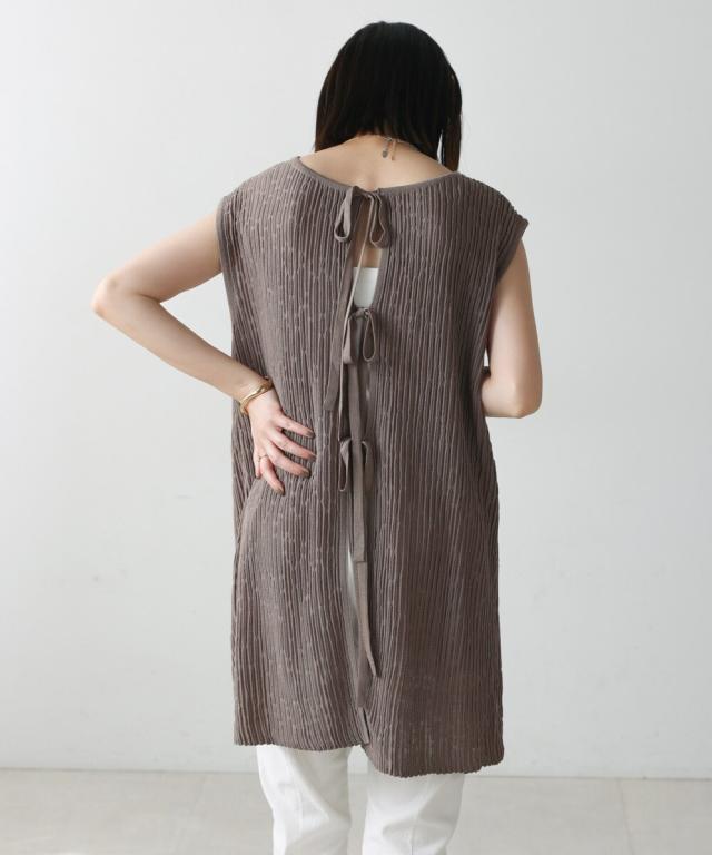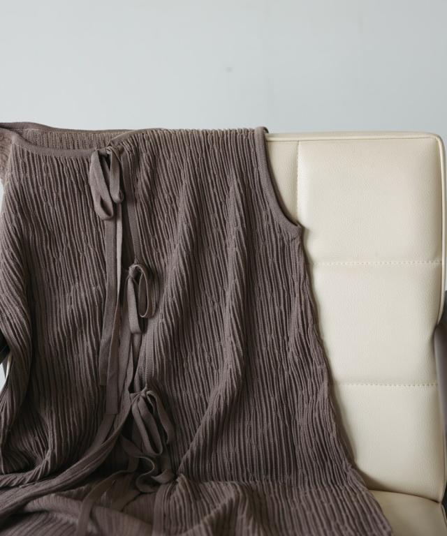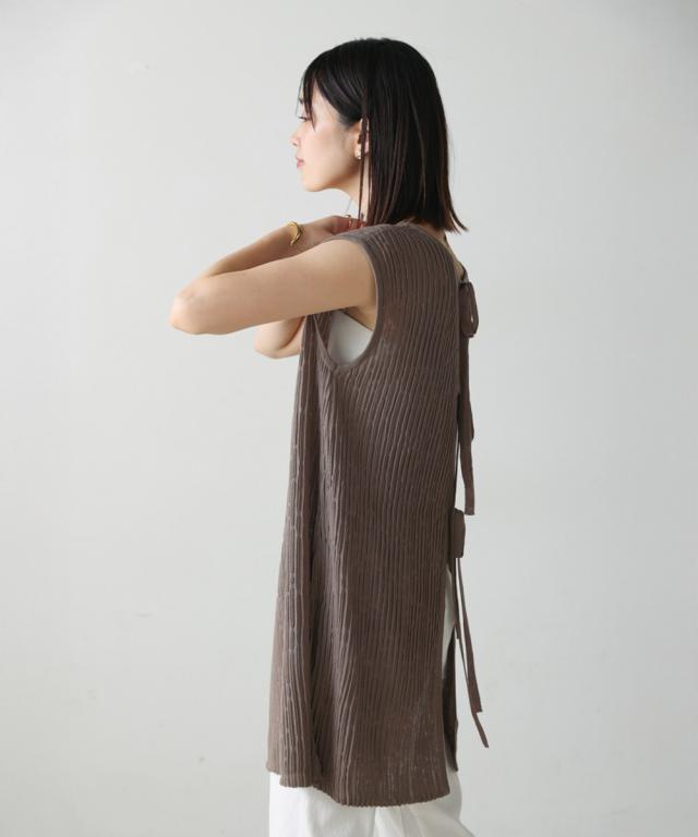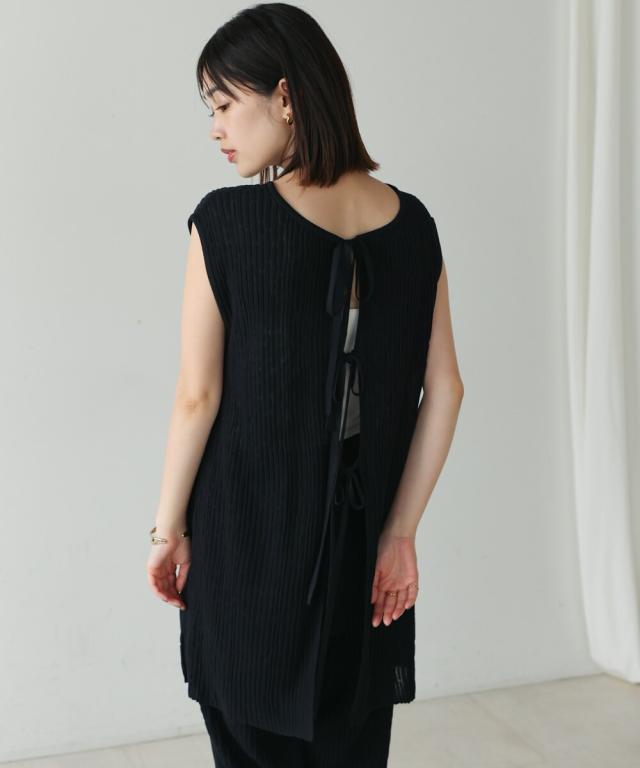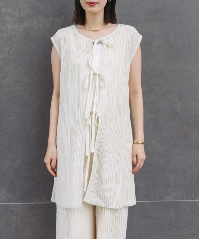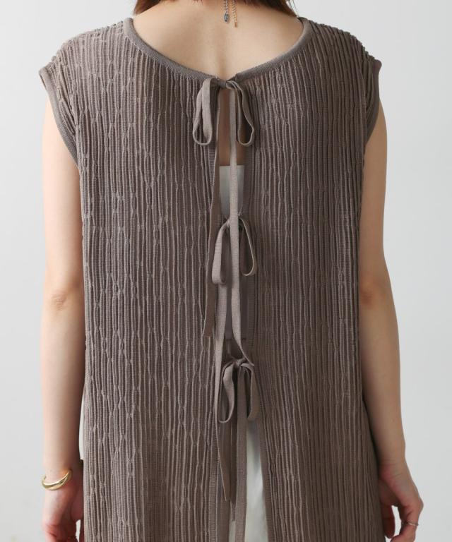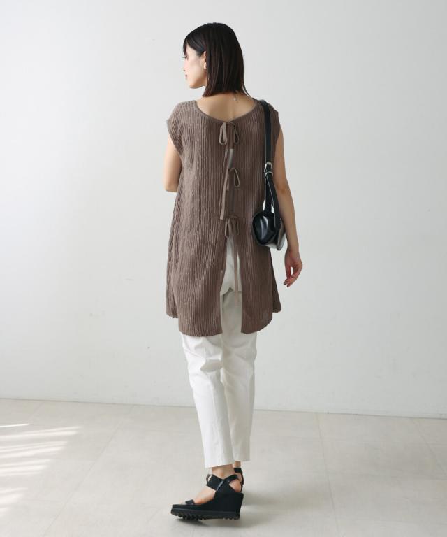 さらりとした素材感のサマーニットTOPS。表面が凹凸感のある表情でシンプルな装いでもコナレタ印象に仕上げてくれます♪BACKリボンにしてシンプルに着ても、リボンを解いて羽織るとジレとしても使って頂けます。肩幅は広めで、落ち感がある素材感なので着になる腕回りを程よく隠してくれます。同素材のパンツ(品番:5525101)とのセットアップコーデもオススメです。