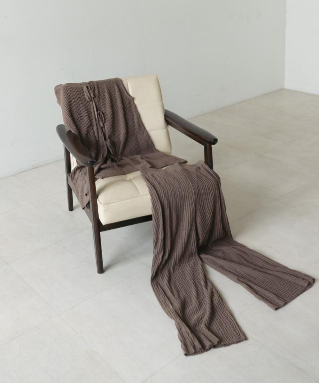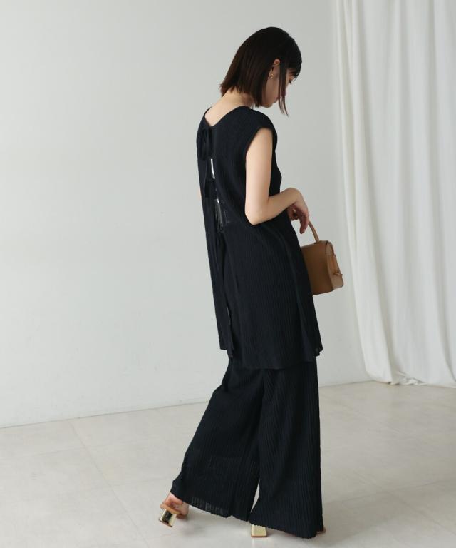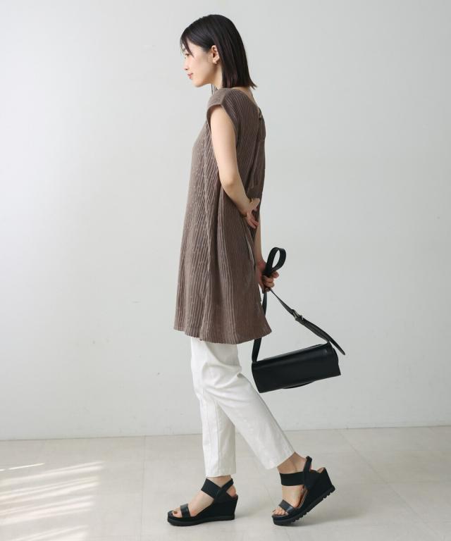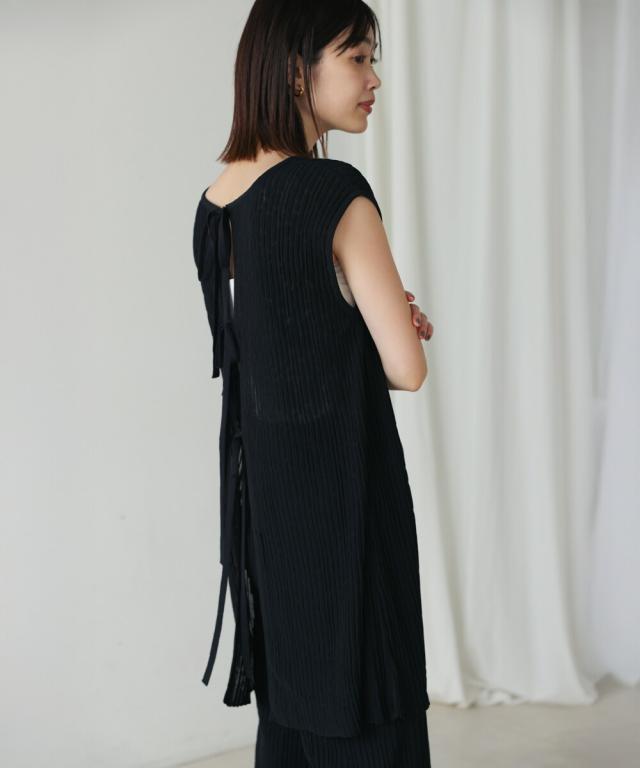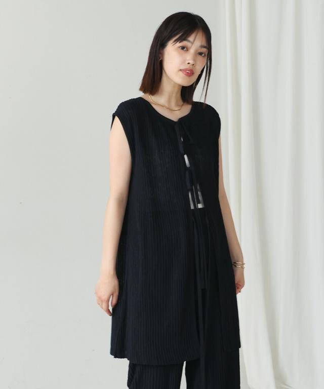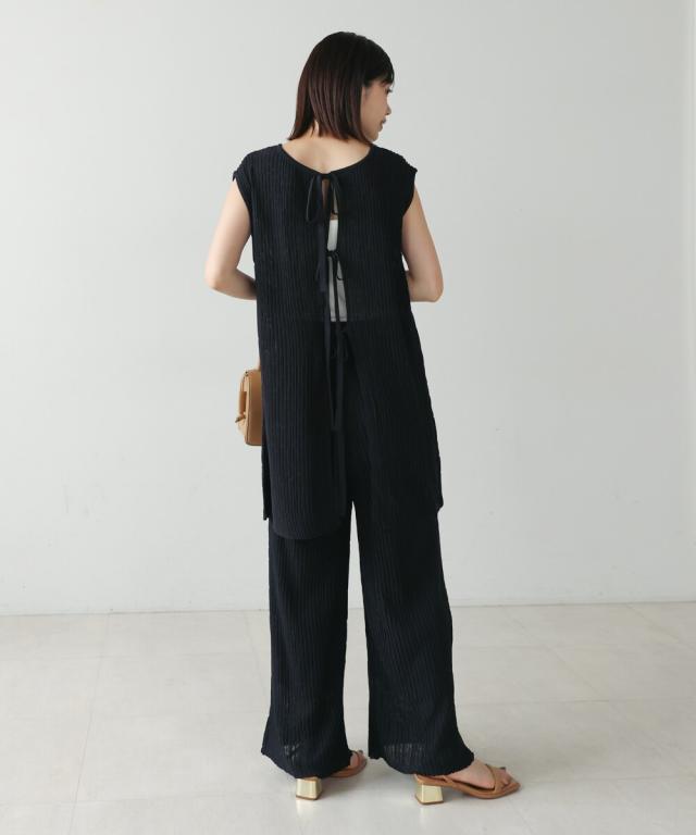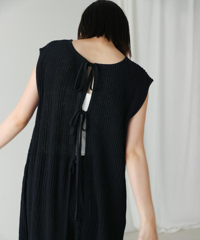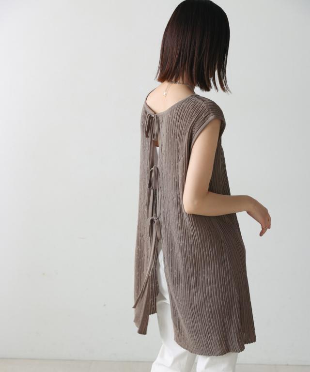 さらりとした素材感のサマーニットTOPS。表面が凹凸感のある表情でシンプルな装いでもコナレタ印象に仕上げてくれます♪BACKリボンにしてシンプルに着ても、リボンを解いて羽織るとジレとしても使って頂けます。肩幅は広めで、落ち感がある素材感なので着になる腕回りを程よく隠してくれます。同素材のパンツ(品番:5525101)とのセットアップコーデもオススメです。