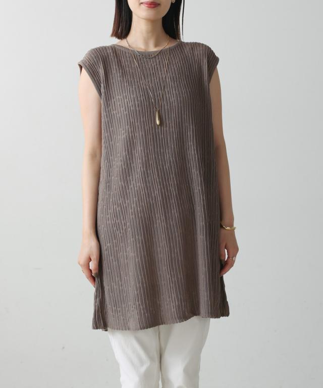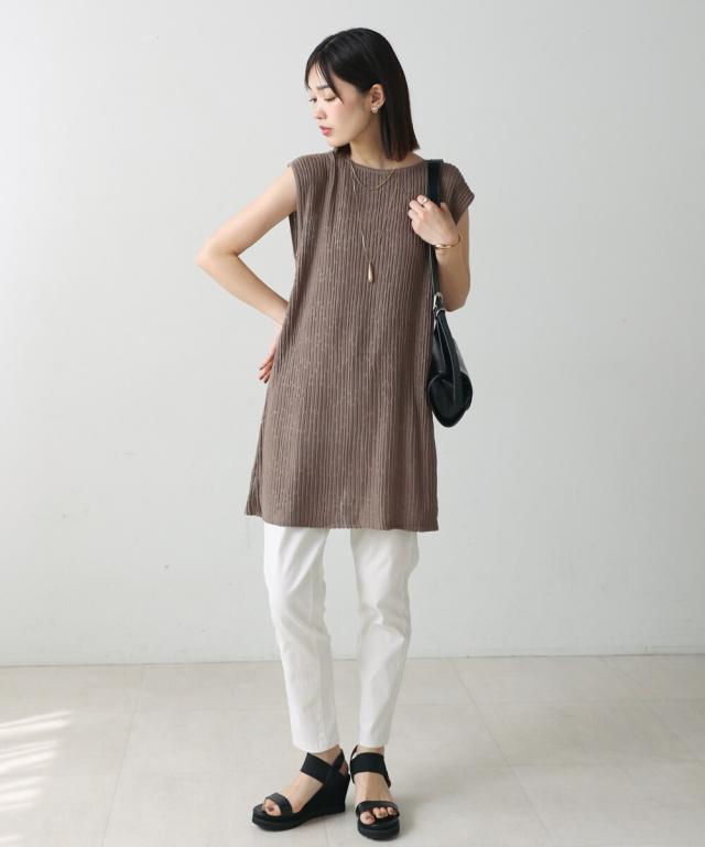 強撚された糸で編んでいるので、さらさらとした素材感のニット素材。凹凸がある編み方で、風が抜けるので涼しく着て頂けます。