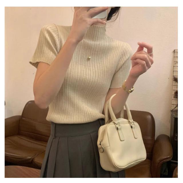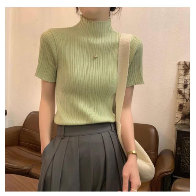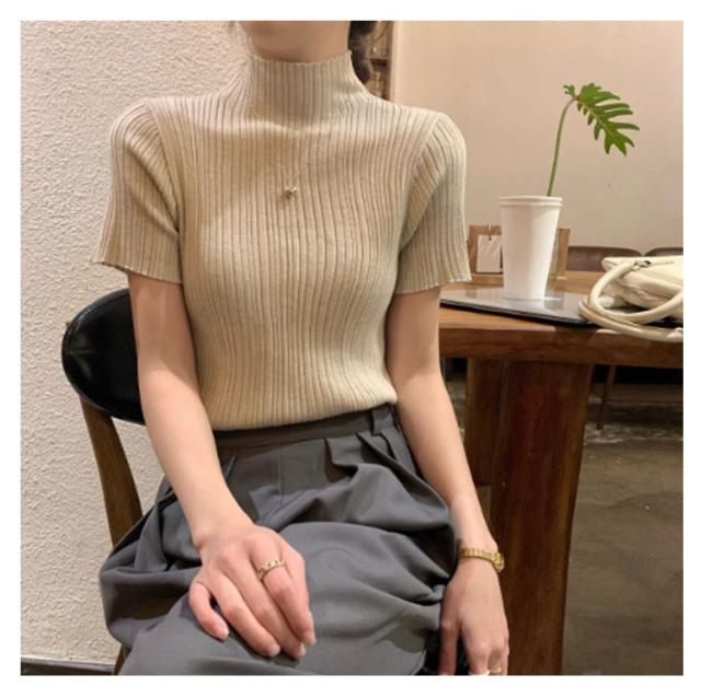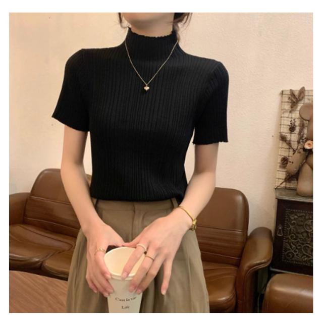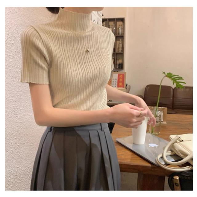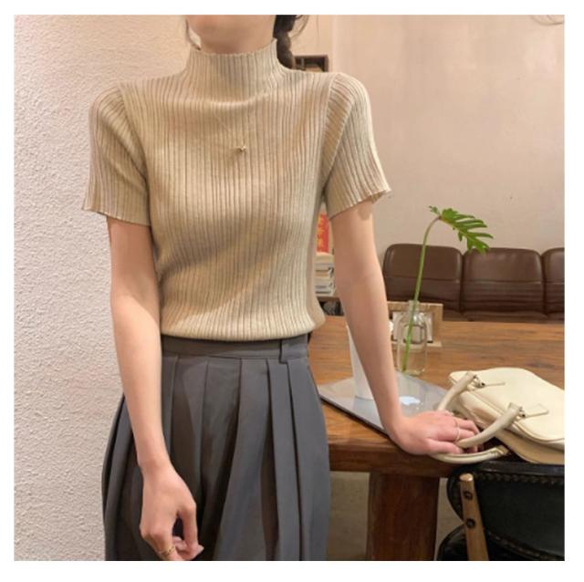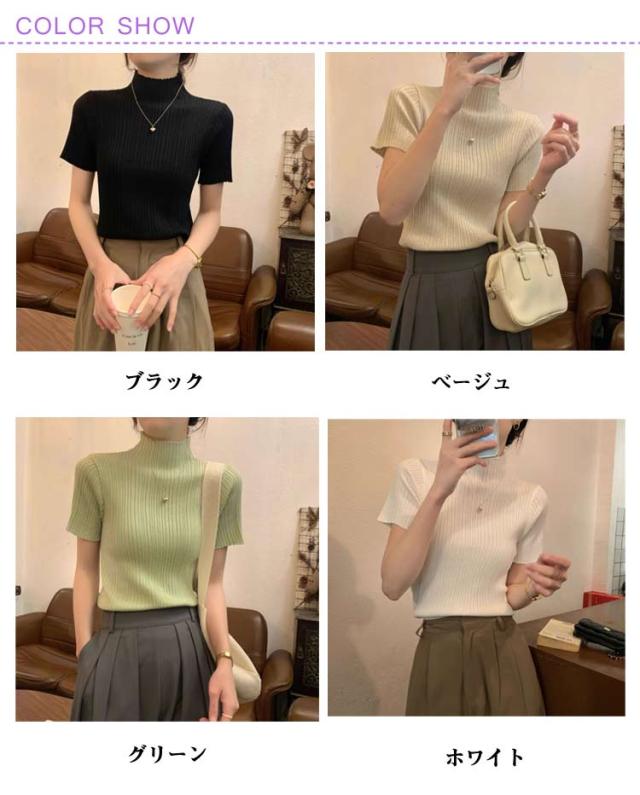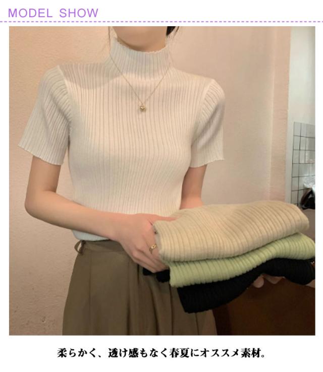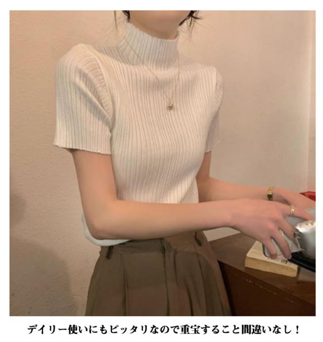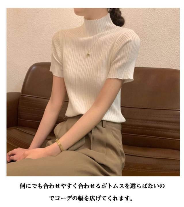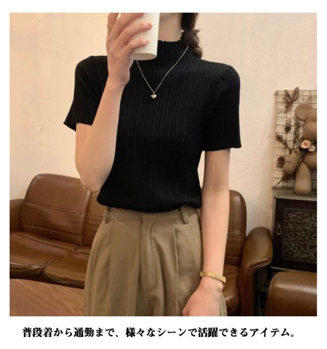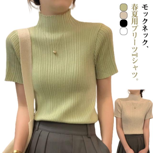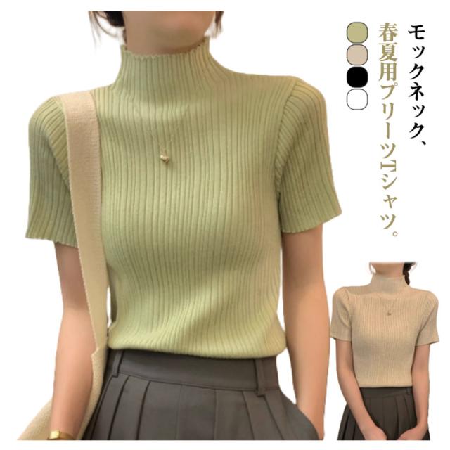 プリーツTシャツ モックネック Tシャツ レディース サマーニット 半袖 レイヤードトップス インナー ニットトップス 半袖Tシャツ おしゃれ 春夏 カジュアル フィット スリム 韓国ファッション S M L XL
