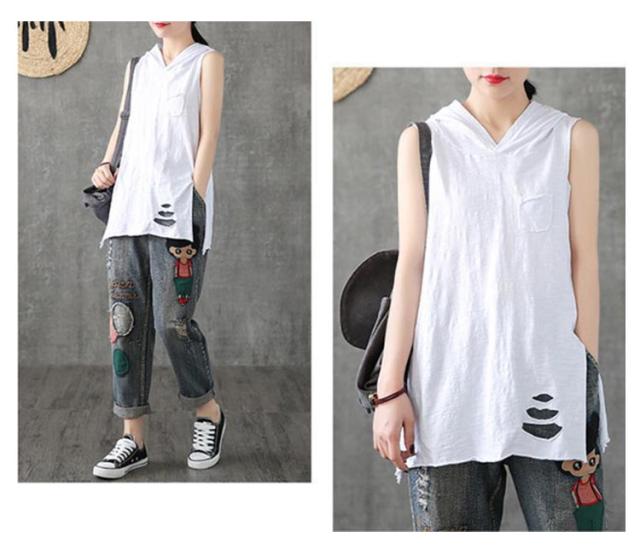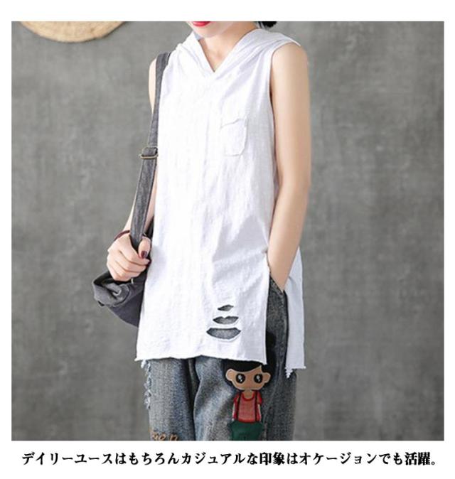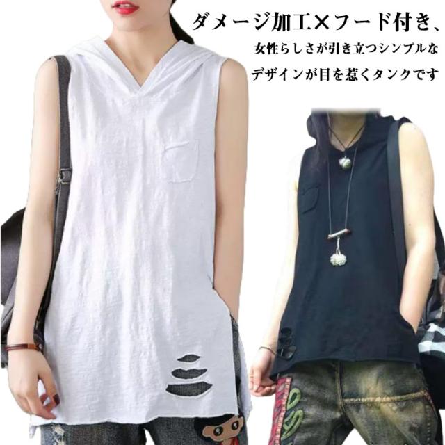 フード付き タンクトップ レディース ロング丈 ノースリーブ Tシャツ レイヤードトップス 大きいサイズ ロングタンクトップ 春 夏 ダメージ加工 きれいめ おしゃれ M L XL 2XL 3XL 4XL