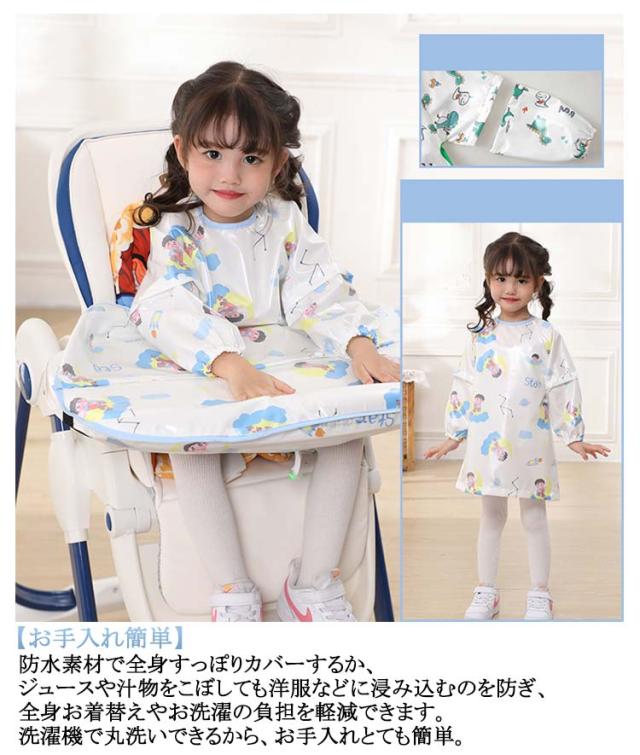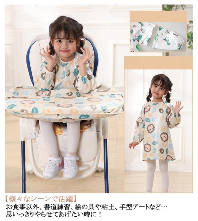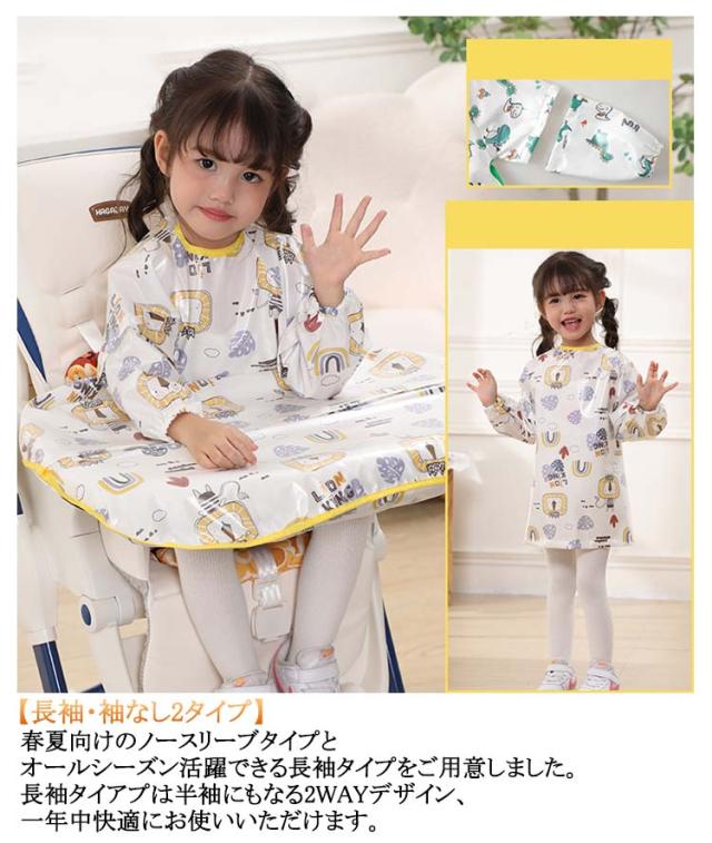| 0-5才向け!吸盤付食器使用可能♪袖取り外し可能♪ 【食べこぼしをしっかりキャッチ】チェアとテーブルに固定できるテーブル一体型エプロ体とテーブルの間に隙間がないから、お洋服もチェアも汚れません◎食事後はエプロンごとさっと片づけるだけ。 【吸盤付食器使用可能】テーブルクロス一体型エプロンはスナップボタンデザインで吸盤付き食器も使えます。さらに、テーブルクロス部分は取り外しできるから、普通のロングエプロンとしても使える2WAY仕様。 【長袖・袖なし2タイプ】春夏向けのノースリーブタイプとオールシーズン活躍できる長袖タイプをご用意しました。長袖タイアプは半袖にもなる2WAYデザイン、一年中快適にお使いいただけます。 【お手入れ簡単】防水素材で全身すっぽりカバーするか、ジュースや汁物をこぼしても洋服などに浸み込むのを防ぎ、全身お着替えやお洗濯の負担を軽減できます。洗濯機で丸洗いできるから、お手入れとても簡単。 【様々なシーンで活躍】お食事以外、書道練習、絵の具や粘土、手型アートなど…思いっきりやらせてあげたい時に! 【ハイチェアもローチェアも適応】市販のほとんどのベビーチェアに使えます。 | |