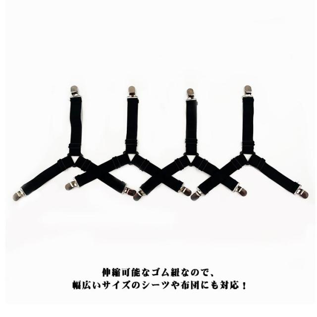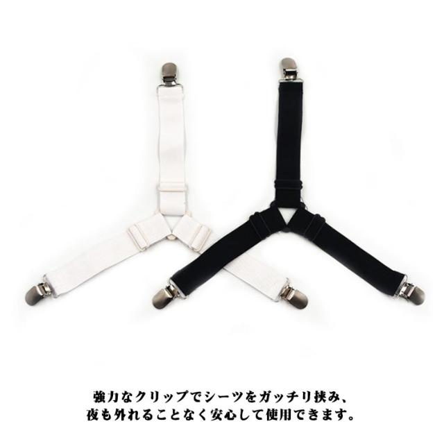 | 挟むだけでスッキリベッドメイク♪お布団シーツにも!強力なクリップでシーツをガッチリ挟み、夜も外れることなく安心して使用できます。 伸縮可能なゴム紐なので、幅広いサイズのシーツや布団にも対応! | |