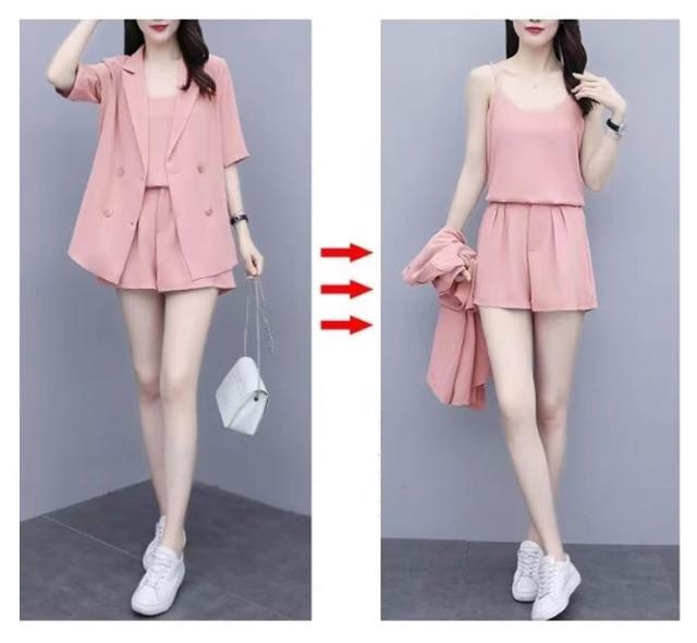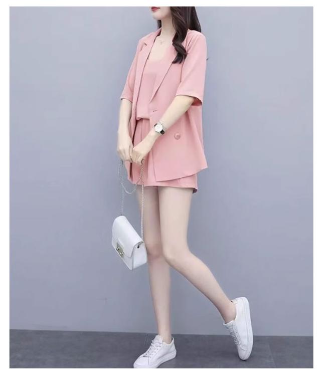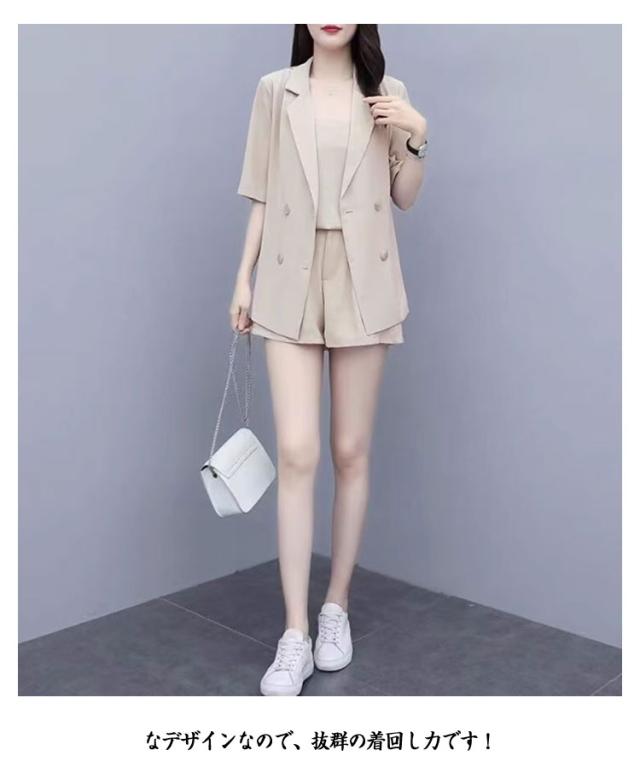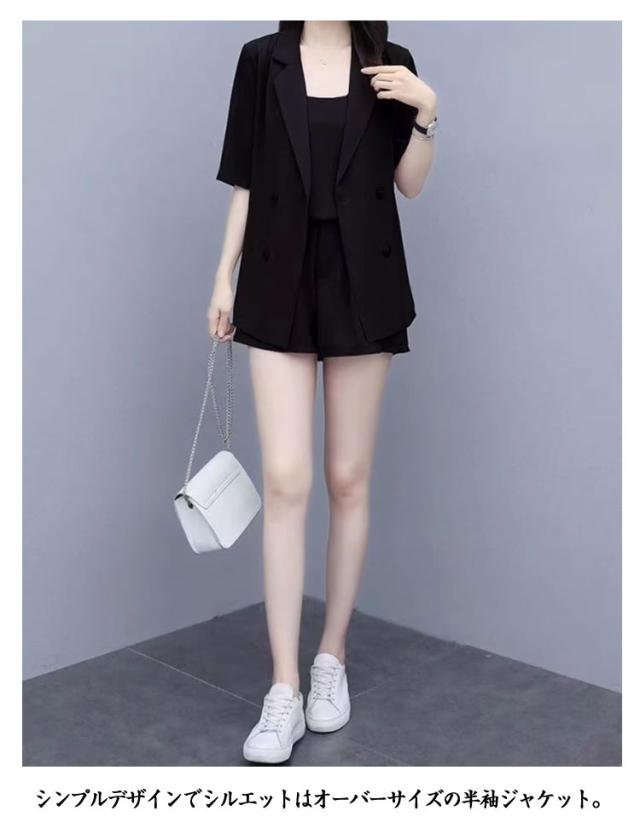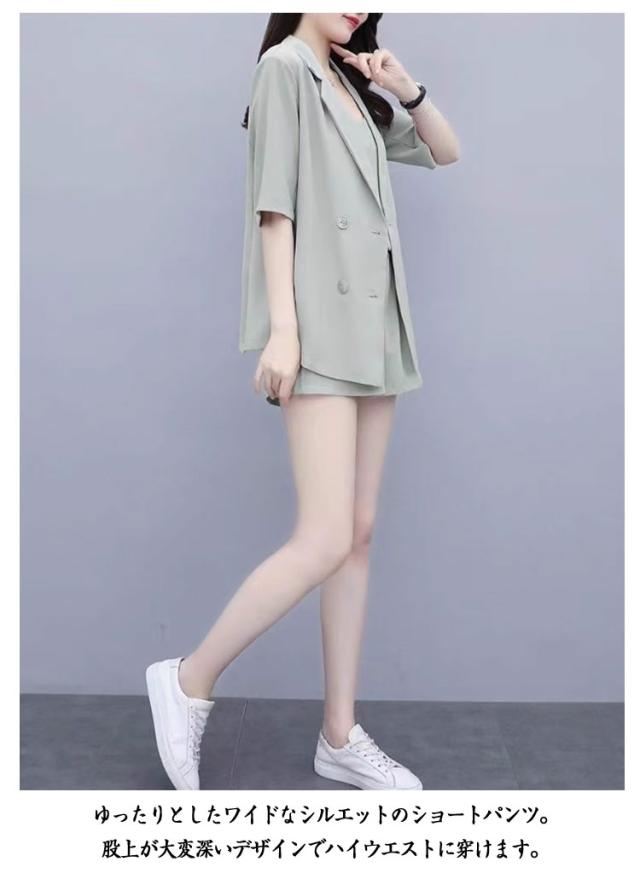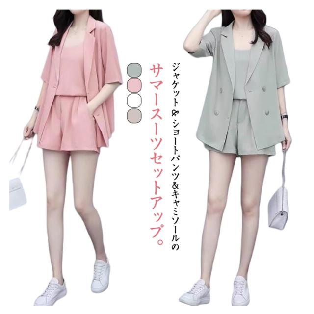 パンツスーツ レディース サマースーツ 夏 セットアップ 半袖 ジャケット ショートパンツ キャミソール 3点セット カッコイイ 無地 上下セット カジュアルスーツ とろみ ショーパン きれいめ オフィス カジュアル ブラック ピンク グリーン ベージュ