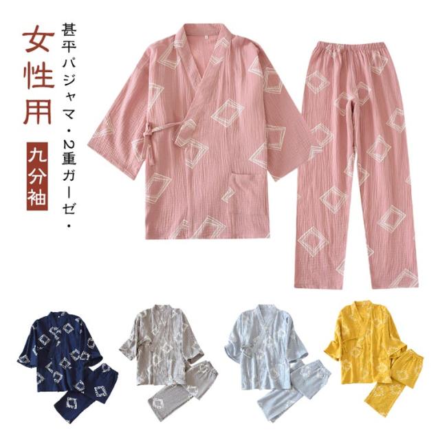甚平 ワンマイルウエア ゆったり Vネック 甚平ルームウエア 2重ガーゼ パジャマ 九分袖 長ズボン 通気性 上下セット カジュアル 女性用 薄手 甚平風 寝巻き 普段着 レディース テレワーク 在宅 夏祭り 花火大会 贈り物 春夏秋
