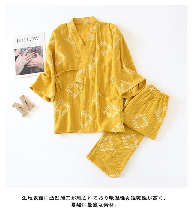 | 甚平パジャマ・2重ガーゼ・女性用 浴衣のような前開きパジャマ上下セパレートが脱着簡単。 さらさらとした素材を使っているので眠るときにもオススメ。 生地表面に凸凹加工が施されており吸湿性&速乾性が高く、夏場に最適な素材。 通気性と吸水、吸湿性に優れたガーゼ素材 とっても涼しいうえにエアコンなどの 冷えからもしっかりガードしてくれます。 肌ざわりが優しく風通しが良いので、部屋着や寝間着などリラックスウェアとして重宝します。プレゼントとしてもおすすめ。 | |