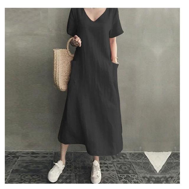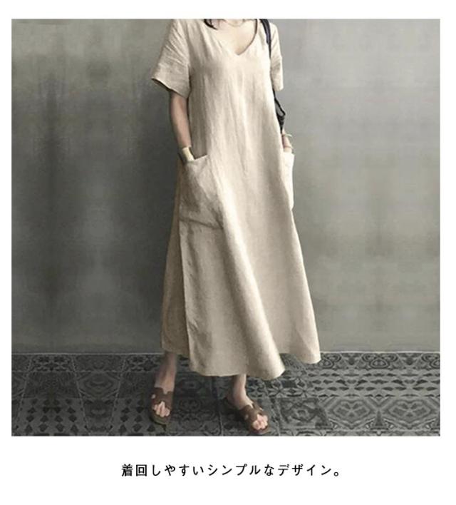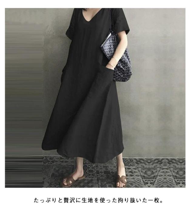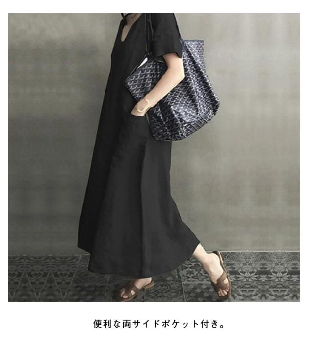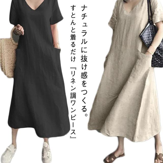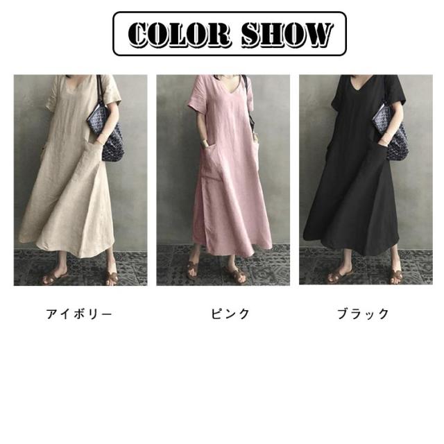 ロングワンピース 半袖 ワンピース レディース Vネック 夏 Iライン ポケット付き 春 体型カバー ワンピース 半袖ワンピース ゆったり Aラインワンピ ロングワンピ ブラック ピンク アイボリー 大人 カジュアル 可愛い 30代 40代