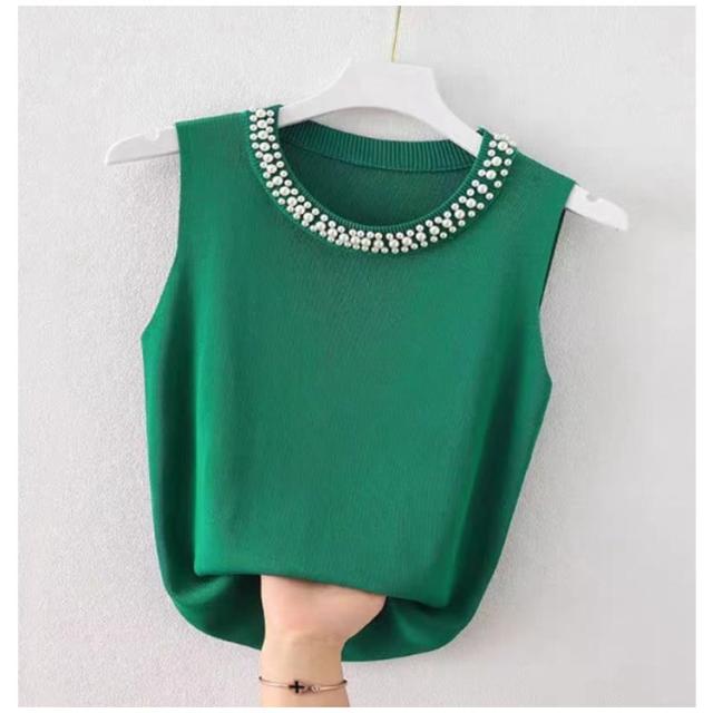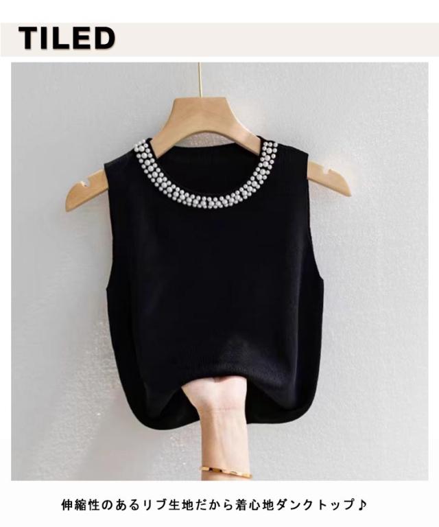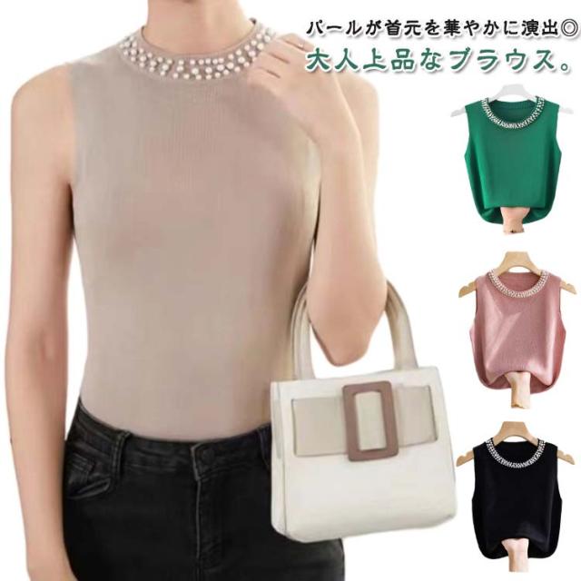 | 伸縮性のあるリブ生地だから着心地ダンクトップ♪ パールが首元を華やかに演出◎大人上品なブラウス。 トップスとしてだけでなく、優しい肌触りのインナーとしても着回しOK。 | |