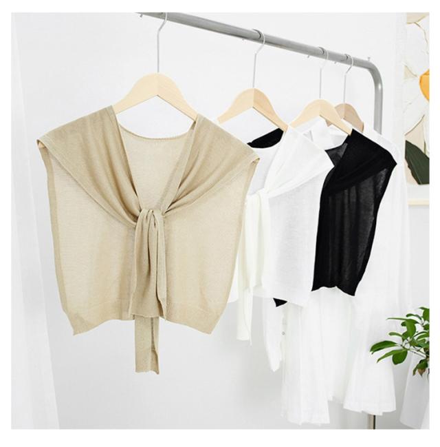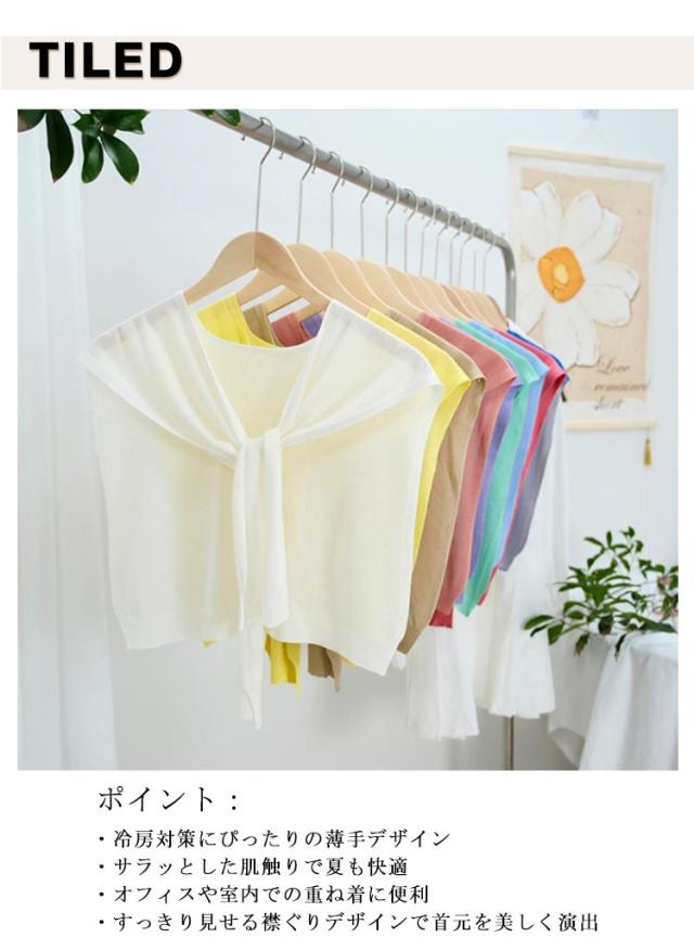 | アイスシルクカーディガン風つけ襟 冷房対策 オフィス用にも◎ 素材:アイスシルク(柔らかく通気性のある薄手素材) ポイント: ・冷房対策にぴったりの薄手デザイン ・サラッとした肌触りで夏も快適 ・オフィスや室内での重ね着に便利 ・すっきり見せる襟ぐりデザインで首元を美しく演出 シンプルな無地デザインで、ワンピースやTシャツ、ブラウスとの相性抜群!ファッション性と実用性を兼ね備えた人気アイテムです。 | |