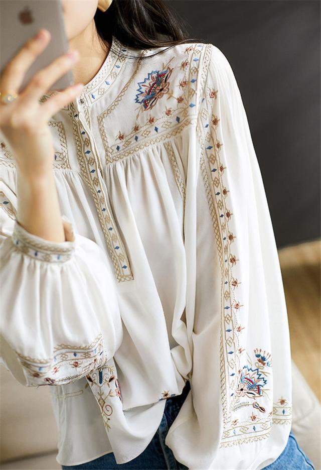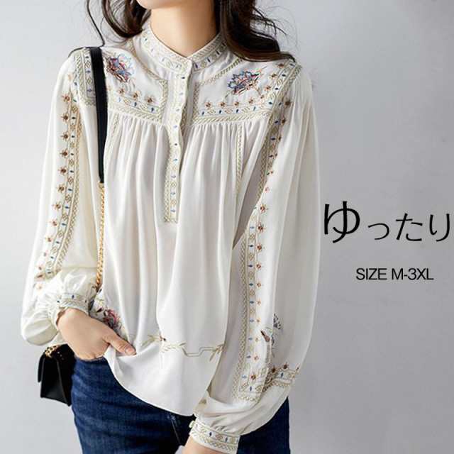 ブラウス レディース シャツ 長袖 パフスリーブ スタンドカラー 綿 刺繍 ボヘミア風 ゆったり きれいめ オシャレ 大人 春秋