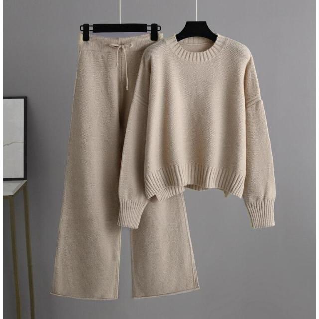 ニット セットアップ ワイドパンツ レディース 秋冬 長袖 ラウンドネック ケーブル編み おしゃれ セーター ニットパンツ 部屋着 ママ ガウチョパンツ