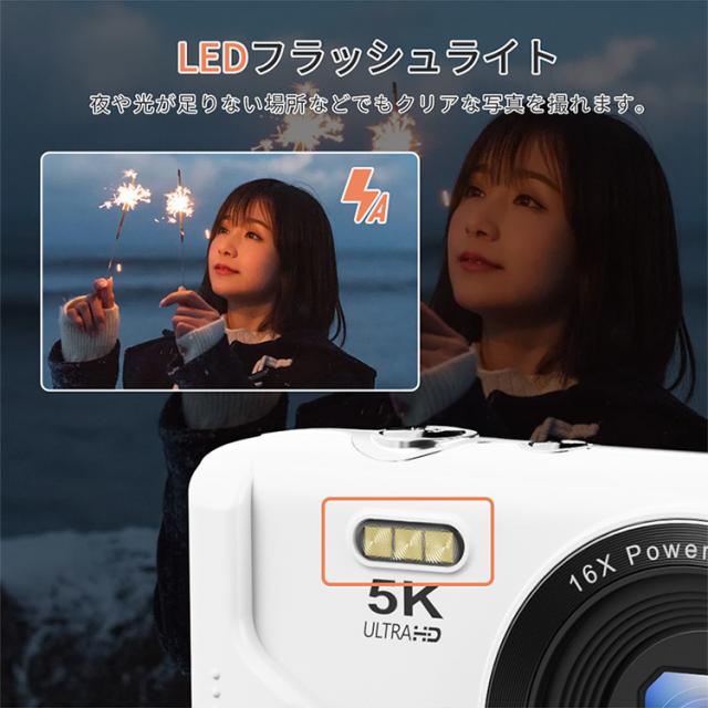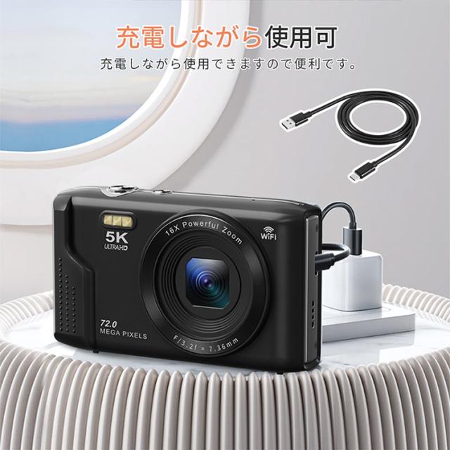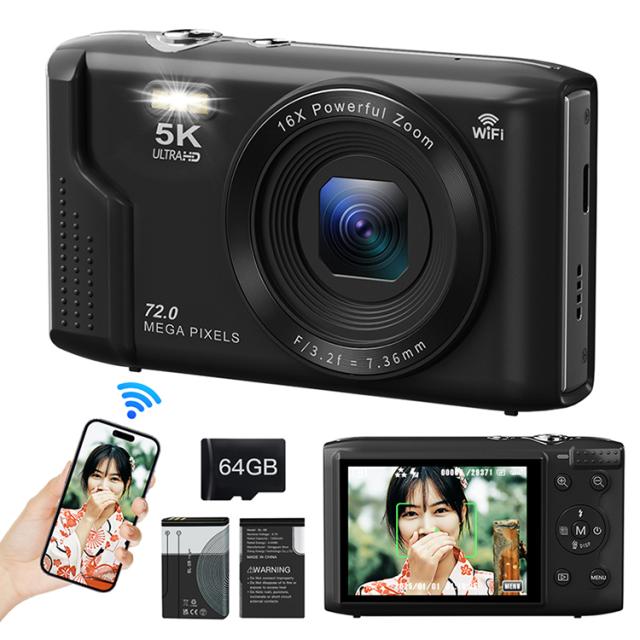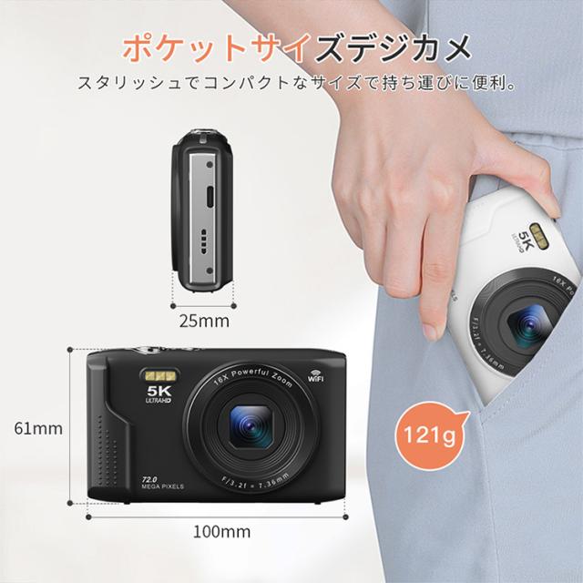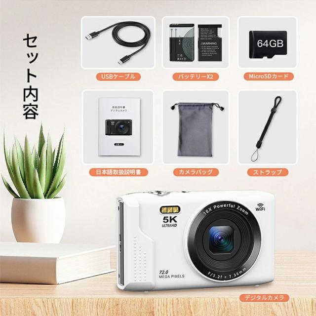 【5K 7200万画素 WIFI対応】デジカメ デジタルカメラ カメラ コンデジ 日本製チップ デュアルレンズ スマホに送れる 64GBマイクロSDカード付き 16倍ズーム オートフォーカス機能 ウェブカメラ バッテリー2枚 スマホ転送 父の日