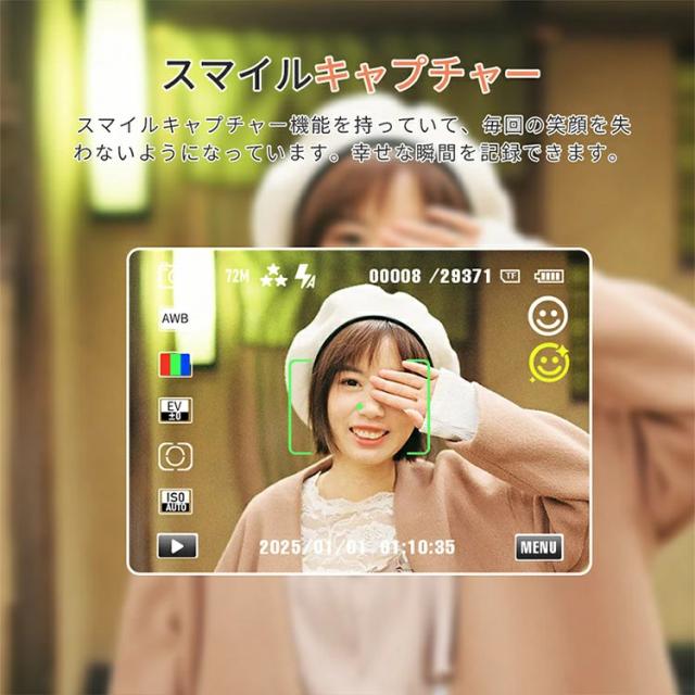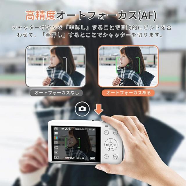 | 商品説明 | 【WIFI転送機能】今まで少ない本体にWIFI機能を搭載されておるコンパクトデジタルカメラです。撮影画像の取り扱いにおいて、スマホを手軽に活用できるのがWi-Fi対応デジタルカメラのメリットです。専用アプリより撮った画像や動画をスマホに転送でき、コードレスでシェアでき、カードリーダーやパソコンなどを利用する必要がありません。デジカメのWi-Fi機能によって外出先でも簡単にスマホと連携できるため、撮影した画像の転送やSNS投稿などの操作がスムーズにこなせます。下ボタンを長押すするとWiFi機能をオン/オフにすることができます。 |