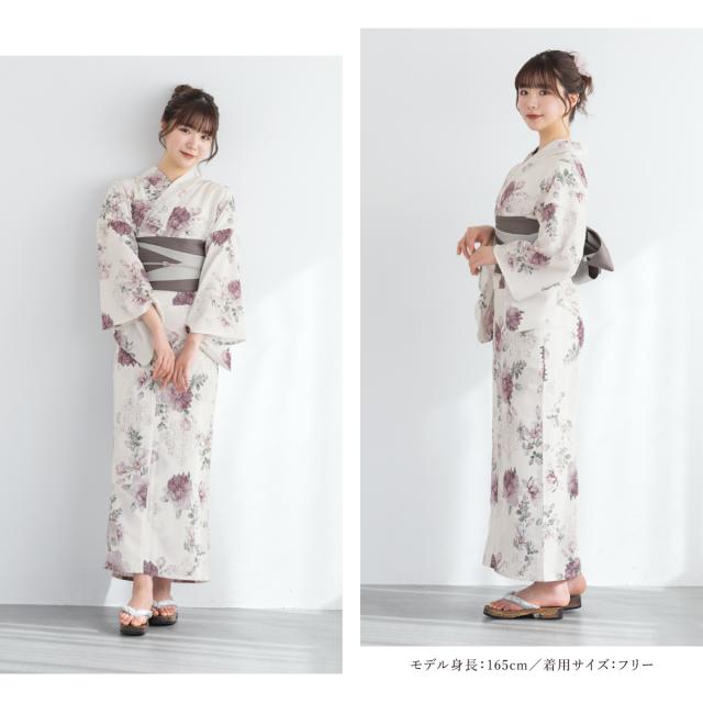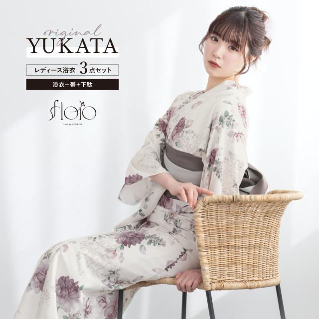 浴衣 セット レディース 浴衣セット 半幅帯 2025 floro 簡単 涼しい コーディネート済み 吸水速乾 白 紫 ピンク グレー ニュアンス おしゃれ 可愛い 下駄 S フリー 送料無料